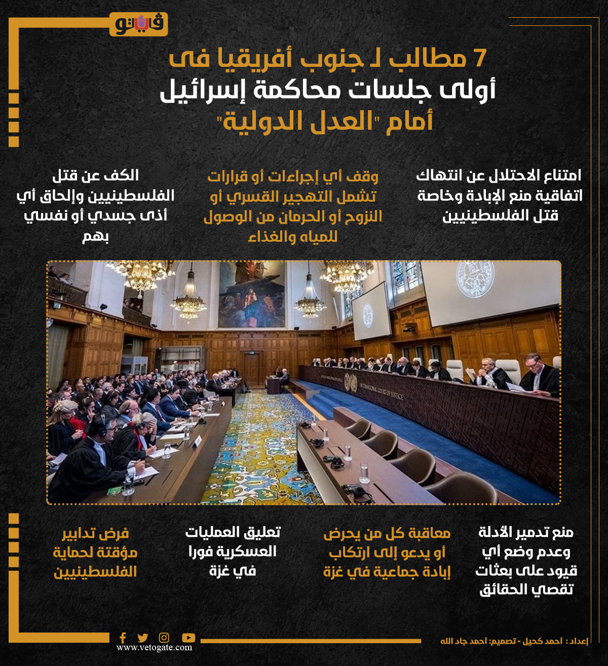 7 مطالب لـ جنوب أفريقيا فى أولى جلسات محاكمة إسرائيل أمام "العدل الدولية" (إنفوجراف) الخميس 11/يناير/2024 - 07:00 م 1/11/2024 7:00:55 PM محكمة العدل الدولية، فيتو أحمد كحيل شارك طباعة 18 حجم الخط شارك طباعة غزة محكمة العدل الدولية افريقيا جنوب أفريقيا محاكمة إسرائيل
