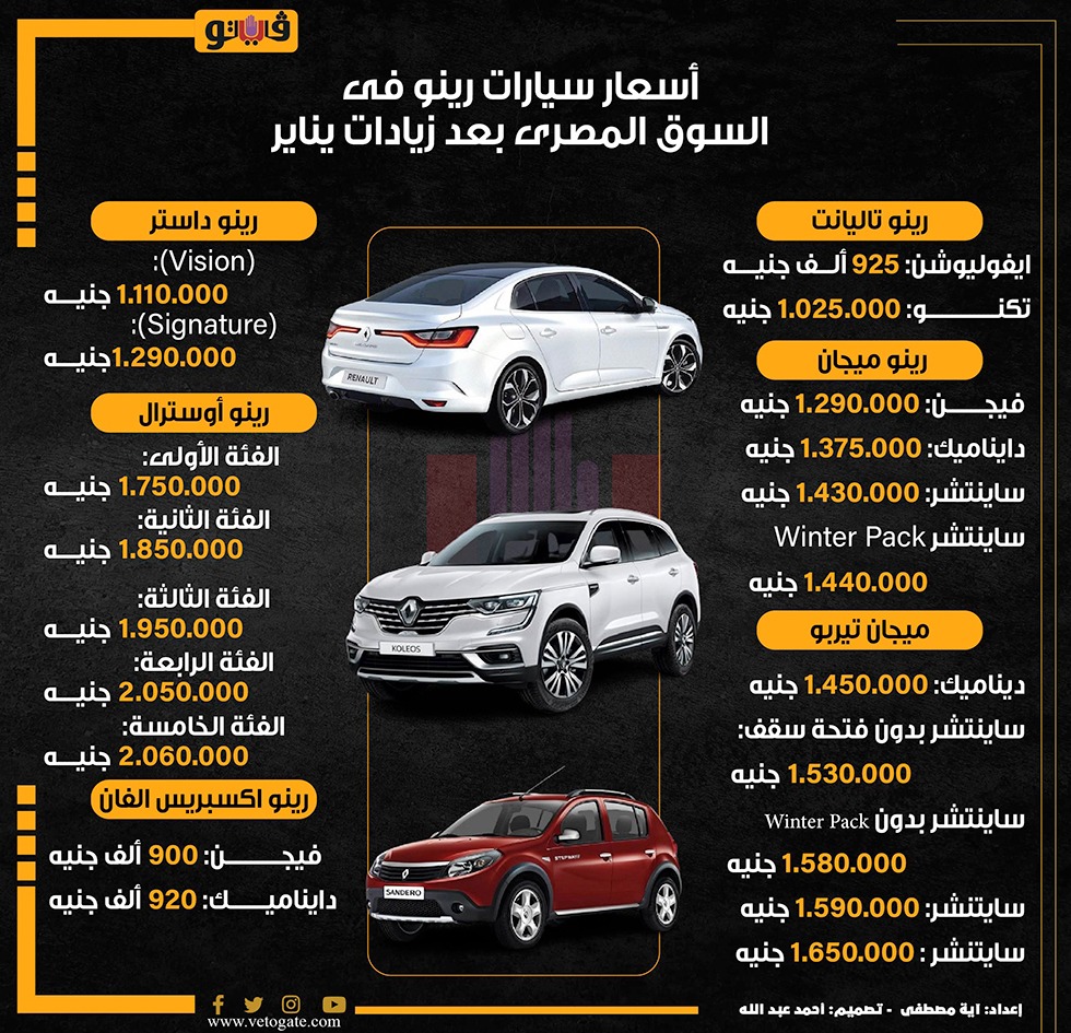 أسعار سيارات رينو فى السوق المصرى بعد زيادات يناير (إنفوجراف) الأحد 14/يناير/2024 - 02:20 م 1/14/2024 2:20:31 PM سيارات آية أحمد شارك طباعة 18 حجم الخط شارك طباعة الفئة الثانية الفئة الاولي رينو ميجان رينو داستر رينو