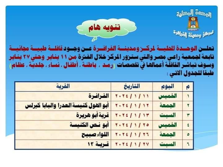 أعلنت الوحدة المحلية لمركز ومدينة الفرافرة، بمحافظة الوادي الجديد، تنظيم قافلة طبية مجانية بالتنسيق والتعاون جمعية راعـي مصـر والتي ستزور المركز خلال الفترة من 11 يناير والتي تستمر في تقديم خدماتها حتى يوم السبت 27 يناير الجاري 2024.