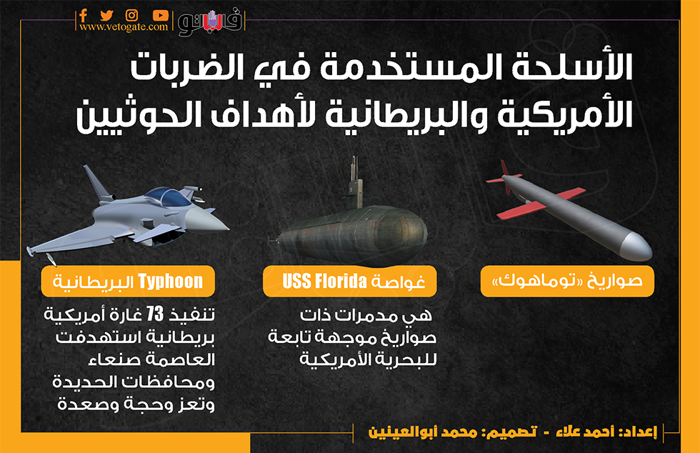 الأسلحة المستخدمة في الضربات الأمريكية والبريطانية لأهداف الحوثيين (إنفوجراف) الجمعة 12/يناير/2024 - 03:21 م 1/12/2024 3:21:09 PM اليمن، فيتو احمد علاء شارك طباعة 18 حجم الخط شارك طباعة اليمن الحوثى الضربات الأمريكية البريطانية لليمن صواريخ توماهوك مقاتلات Typhoon البريطانية الحديدة