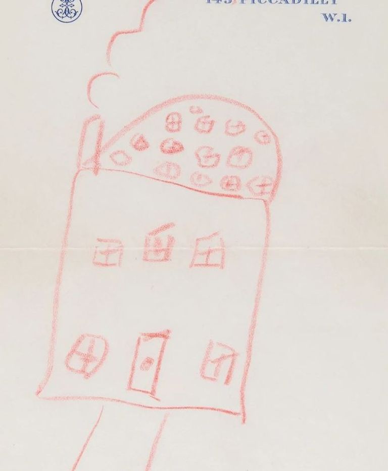 الرسم باللون الأحمر، وأكدت الدار أنه جاء ضمن رسالة من والدة الملكة إلى كاتب مسرحي وصديق العائلة.