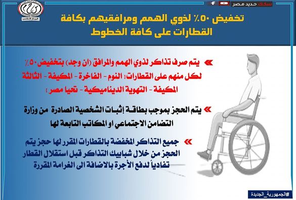 تقوم الهيئة بصرف تذاكر لذوي الهمم والمرافق (إن وجد) بتخفيض 50% لكل منهم للقطارات المكيفة والقطارات الفاخرة والروسي المكيفة وذاتية التهوية والقطارات العادية بموجب بطاقة إثبات الشخصية الصادرة من وزارة التضامن الاجتماعي او المكاتب التابعة لها وسيمح لهم حجز التذاكر من خلال شبابيك الحجز الموجودة بالمحطات قبل استقلال القطار تفاديًا لدفع الأجرة بالإضافة إلى الغرامة المقررة.