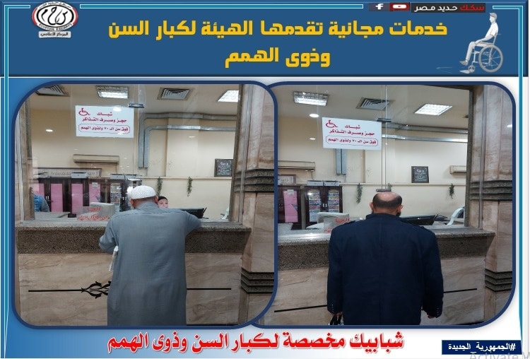 قامت هيئة السكة الحديد بتخصيص شبابيك لكبار السن وذوي الهمم من أجل التيسير عليهم في الحصول على تذاكر القطارات كما وفرت تصاريح السفر لمرضى الأورام السرطانية آليا (كارت ذكي) مدون به بياناته وصورة المريض للحجز به بقطارات الدرجة الثانية المكيفة (الأسباني والفرنسي) بين محطتي القيام والوصول الموضحة بالكارت الذكي والإيصال برحلة واحدة ذهاب وأخرى عودة في اليوم.
