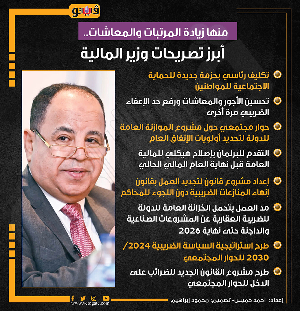 منها زيادة المرتبات والمعاشات.. أبرز تصريحات وزير المالية (إنفوجراف) السبت 13/يناير/2024 - 05:25 م 1/13/2024 5:25:55 PM الدكتور محمد معيط وزير المالية أحمد خميس شارك طباعة 18 حجم الخط شارك طباعة تحسين الأجور وزير المالية محمد معيط حزمة جديدة للحماية الاجتماعية