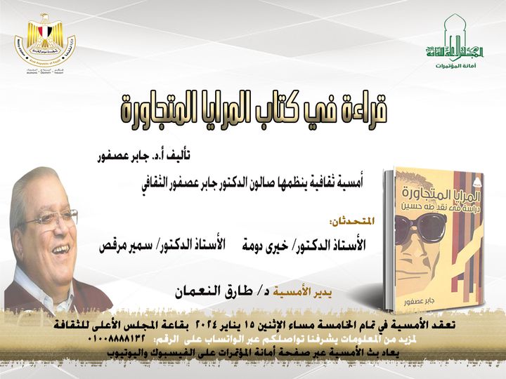 وتنطلق الأمسية الثقافية بعنوان قراءة في كتاب المرايا المتجاورة.. دراسة في نقد طه حسين؛ تأليف المفكر الكبير الراحل الدكتور جابر عصفور، وتبدأ الأمسية في تمام الخامسة مساء الإثنين 15 يناير 2024 بقاعة المجلس الأعلى للثقافة.