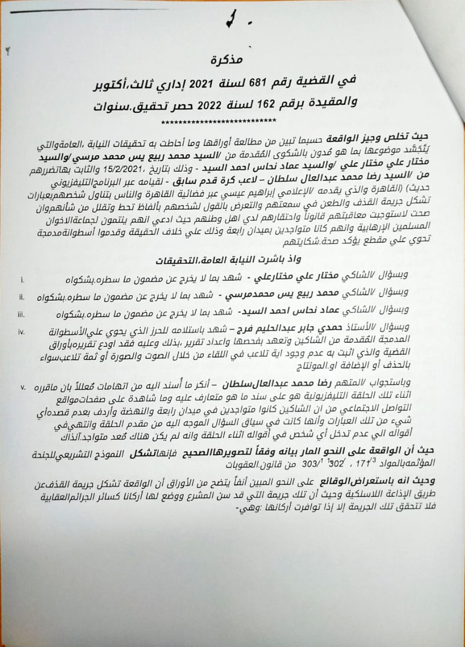 وجاء في التحقيقات أنه وفق ما أحاطت به تحقيقات النيابة العامة، والتي يتجسد موضوعها بما هو مدون بالشكوى المقدمة من محمد ربيع يس محمد مرسي ومختار علي مختار علي وعماد نحاس أحمد السيد - وذلك بتاريخ 15 /2 /2021 والثابت بها تضررهم من رضا محمد عبد العال سلطان - لاعب كرة قدم سابق - لقيامه عبر البرنامج التليفزيوني حديث القاهرة والذي يقدمه الإعلامي إبراهيم عيسى عبر فضائية القاهرة والناس بتناول شخصهم بعبارات تشكل جريمة القذف والطعن في سمعتهم والتعرض بالقول لشخصهم بألفاظ تحط وتقلل من شأنهم وإن صحة لاستوجبت معاقبتهم قانونًا، واحتقارهم لدى أهل وطنهم، حيث ادعى أنهم ينتمون لجماعة الإخوان المسلمين الإرهابية وأنهم كانوا متواجدين بميدان رابعة وذلك على خلاف الحقيقة وقدموا أسطوانة مدمجة تحوي على مقطع يؤكد صحة. شكايتهم.