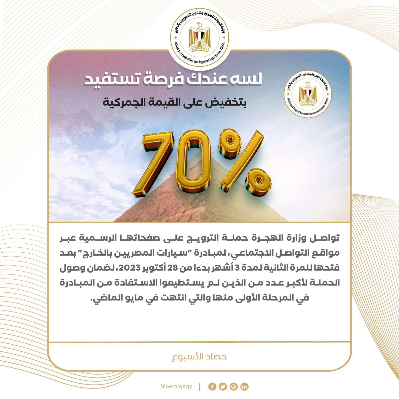 12- تواصل وزارة الهجرة حملة الترويج على صفحاتها الرسمية عبر مواقع التواصل الاجتماعي، لإعادة فتح مبادرة "سيارات المصريين بالخارج" للمرة الثانية لمدة 3 أشهر بدءا من 28 أكتوبر 2023، لضمان وصول الحملة لأكبر عدد من الذين لم يستطيعوا الاستفادة من المبادرة في المرحلة الأولى منها والتي انتهت في مايو الماضي.