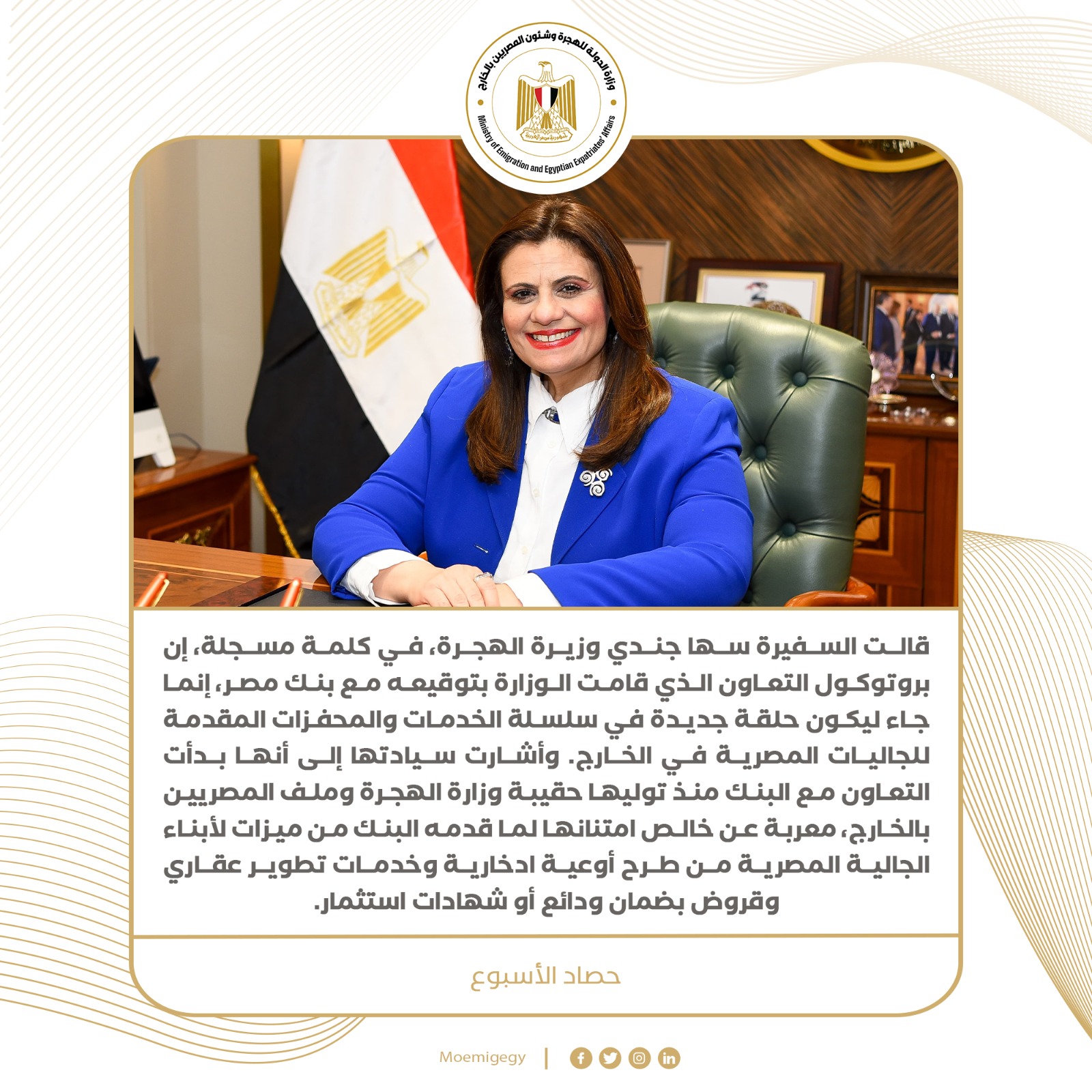 4- قالت السفيرة سها جندي وزيرة الهجرة، في كلمة مسجلة، إن بروتوكول التعاون الذي قامت الوزارة بتوقيعه مع بنك مصر، إنما جاء ليكون حلقة جديدة في سلسلة الخدمات والمحفزات المقدمة للجاليات المصرية في الخارج. وأشارت سيادتها إلى أنها بدأت التعاون مع البنك منذ توليها حقيبة وزارة الهجرة وملف المصريين بالخارج، معربة عن خالص امتنانها لما قدمه البنك من ميزات لأبناء الجالية المصرية من طرح أوعية ادخارية وخدمات تطوير عقاري وقروض بضمان ودائع أو شهادات استثمار.