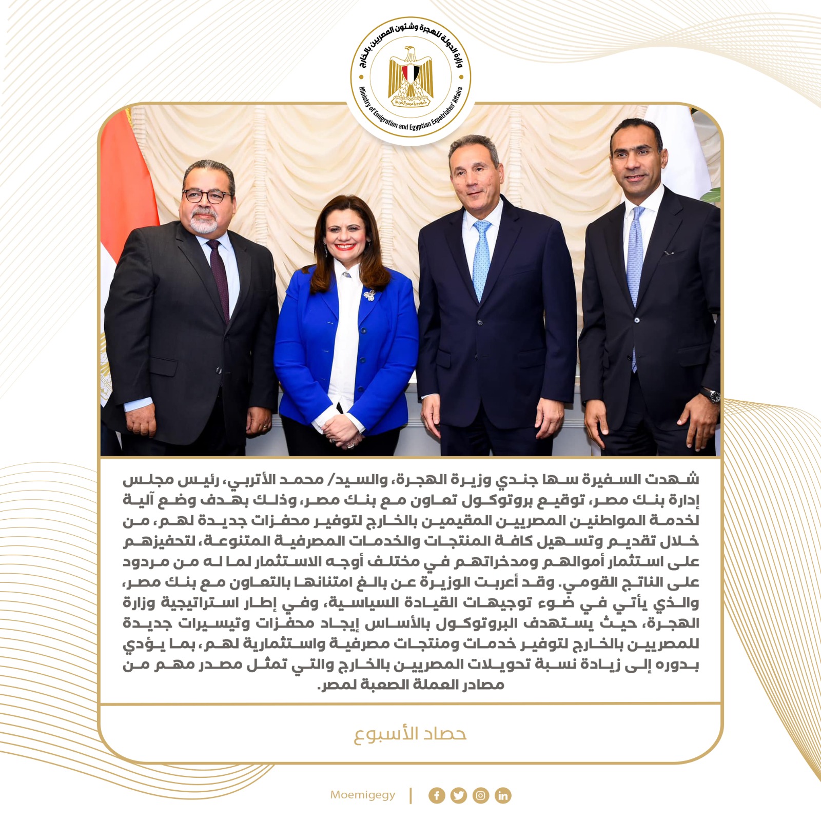 3- شهدت السفيرة سها جندي وزيرة الهجرة، ومحمد الأتربي، رئيس مجلس إدارة بنك مصر، توقيع بروتوكول تعاون مع بنك مصر، وذلك بهدف وضع آلية لخدمة المواطنين المصريين المقيمين بالخارج لتوفير محفزات جديدة لهم، من خلال تقديم وتسهيل كافة المنتجات والخدمات المصرفية المتنوعة، لتحفيزهم على استثمار أموالهم ومدخراتهم في مختلف أوجه الاستثمار لما له من مردود على الناتج القومي. وقد أعربت الوزيرة عن بالغ امتنانها بالتعاون مع بنك مصر، والذي يأتي في ضوء توجيهات القيادة السياسية، وفي إطار استراتيجية وزارة الهجرة، حيث يستهدف البروتوكول بالأساس إيجاد محفزات وتيسيرات جديدة للمصريين بالخارج لتوفير خدمات ومنتجات مصرفية واستثمارية لهم، بما يؤدي بدوره إلى زيادة نسبة تحويلات المصريين بالخارج والتي تمثل مصدر مهم من مصادر العملة الصعبة لمصر.
