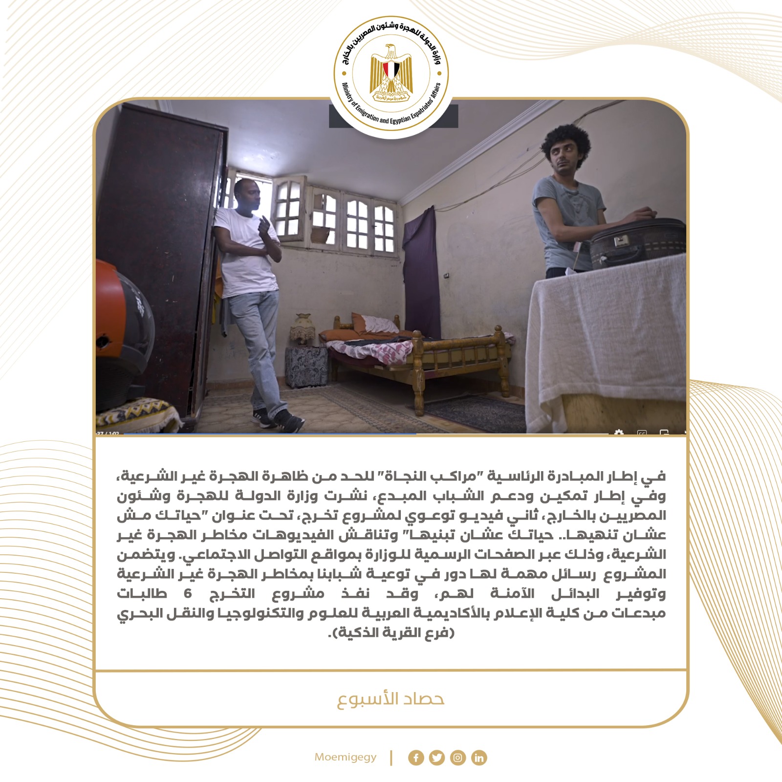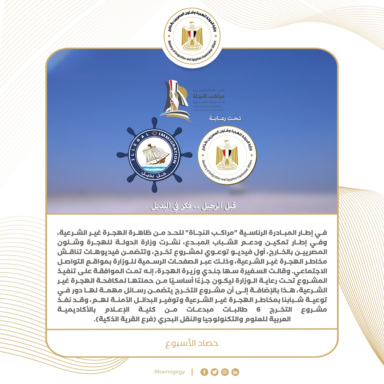10- في إطار المبادرة الرئاسية "مراكب النجاة" وفي إطار تمكين ودعم الشباب المبدع، نشرت وزارة الهجرة ثاني فيديو توعوي لمشروع تخرج، وتتضمن فيديوهات تناقش مخاطر الهجرة غير الشرعية، وذلك عبر الصفحات الرسمية للوزارة بمواقع التواصل الاجتماعي. ويتضمن الفيديو رسائل حول مخاطر الهجرة غير الشرعية، بمشاركة الفنانة عارفة عبد الرسول والفنان أمير صلاح الدين. وأعربت السفيرة سها جندي وزيرة الهجرة، عن سعادتها بأفكار الشابات المبدعات صاحبات مشروع التخرج واللاتي اخترن ظاهرة يعاني منها أغلب دول العالم، مشيدة بالرسائل التي تضمنتها الفيديوهات وحرصهن على أن تصل للجمهور المتلقي ببساطة.