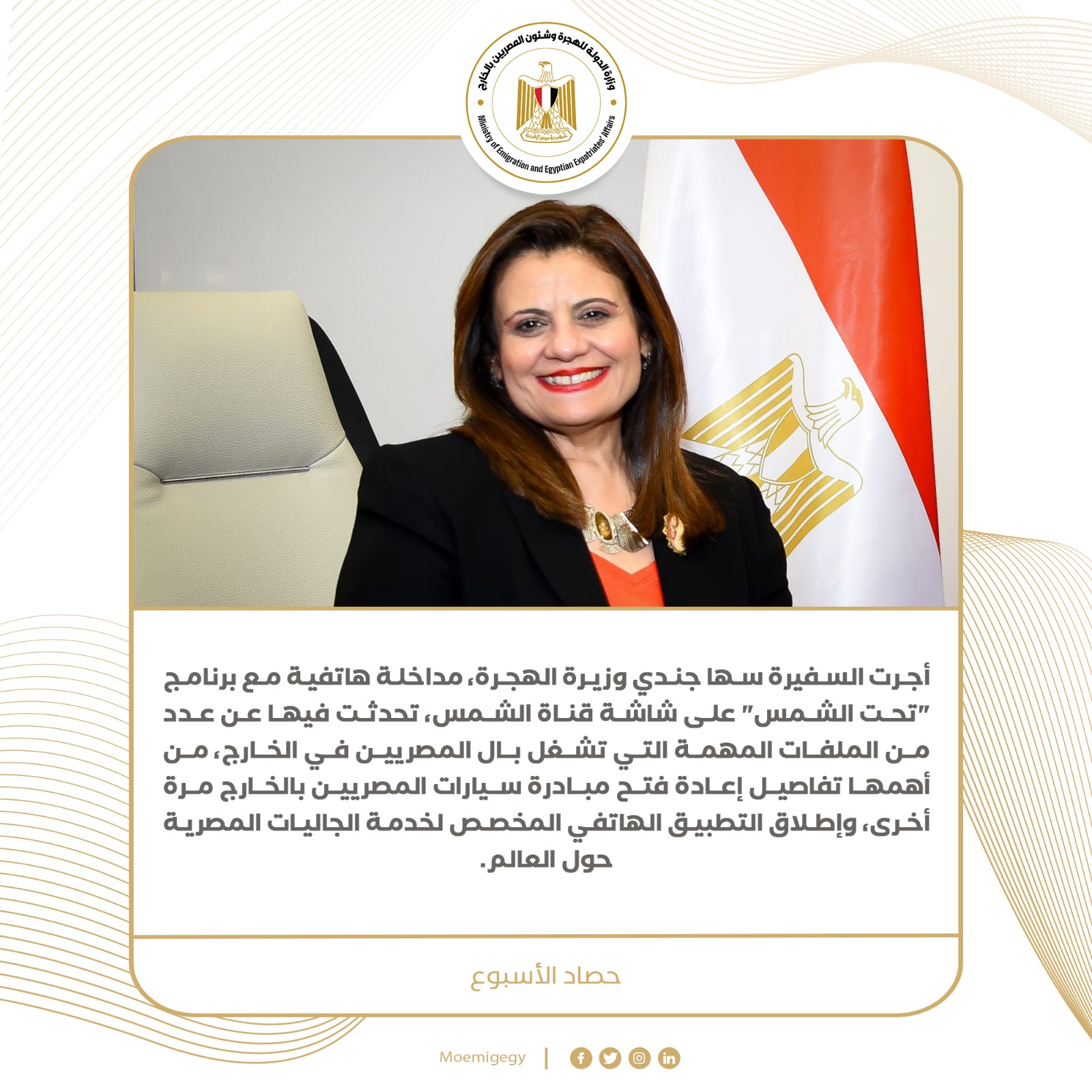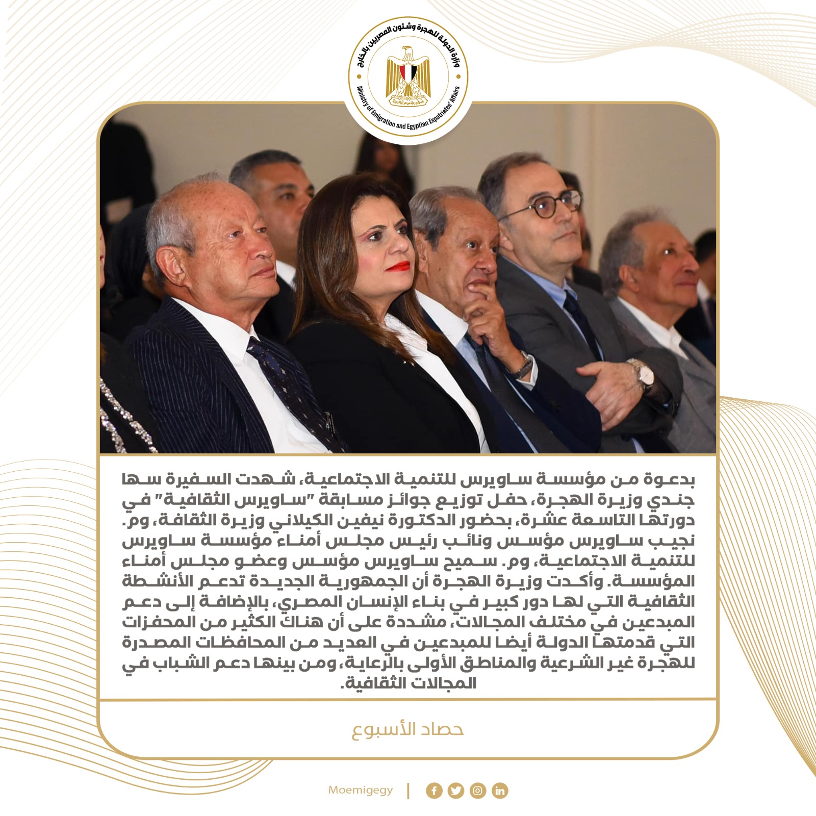 نشرت وزارة الهجرة وشئون المصريين بالخارج حصاد نشاط الوزارة خلال الأسبوع الماضي والذي شهد عدد من الفعاليات والأنشطة التي تضمنت ما يلي: