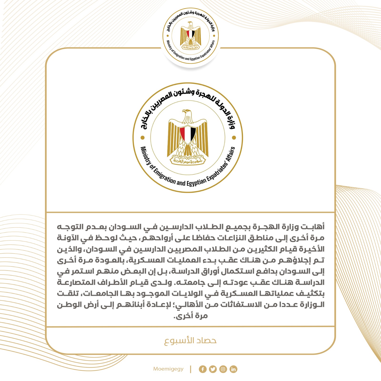 11- أهابت وزارة الهجرة بجميع الطلاب الدارسين في السودان بعدم التوجه مرة أخرى إلى مناطق النزاعات حفاظا على أرواحهم، حيث لوحظ في الآونة الأخيرة قيام الكثيرين من الطلاب المصريين الدارسين في السودان، والذين تم إجلاؤهم من هناك عقب بدء العمليات العسكرية، بالعودة مرة أخرى إلى السودان بدافع استكمال أوراق الدراسة، بل إن البعض منهم استمر في الدراسة هناك عقب عودته إلى جامعته. ولدى قيام الأطراف المتصارعة بتكثيف عملياتها العسكرية في الولايات الموجود بها الجامعات، تلقت الوزارة عددا من الاستغاثات من الأهالي؛ لإعادة أبنائهم إلى أرض الوطن مرة أخرى.