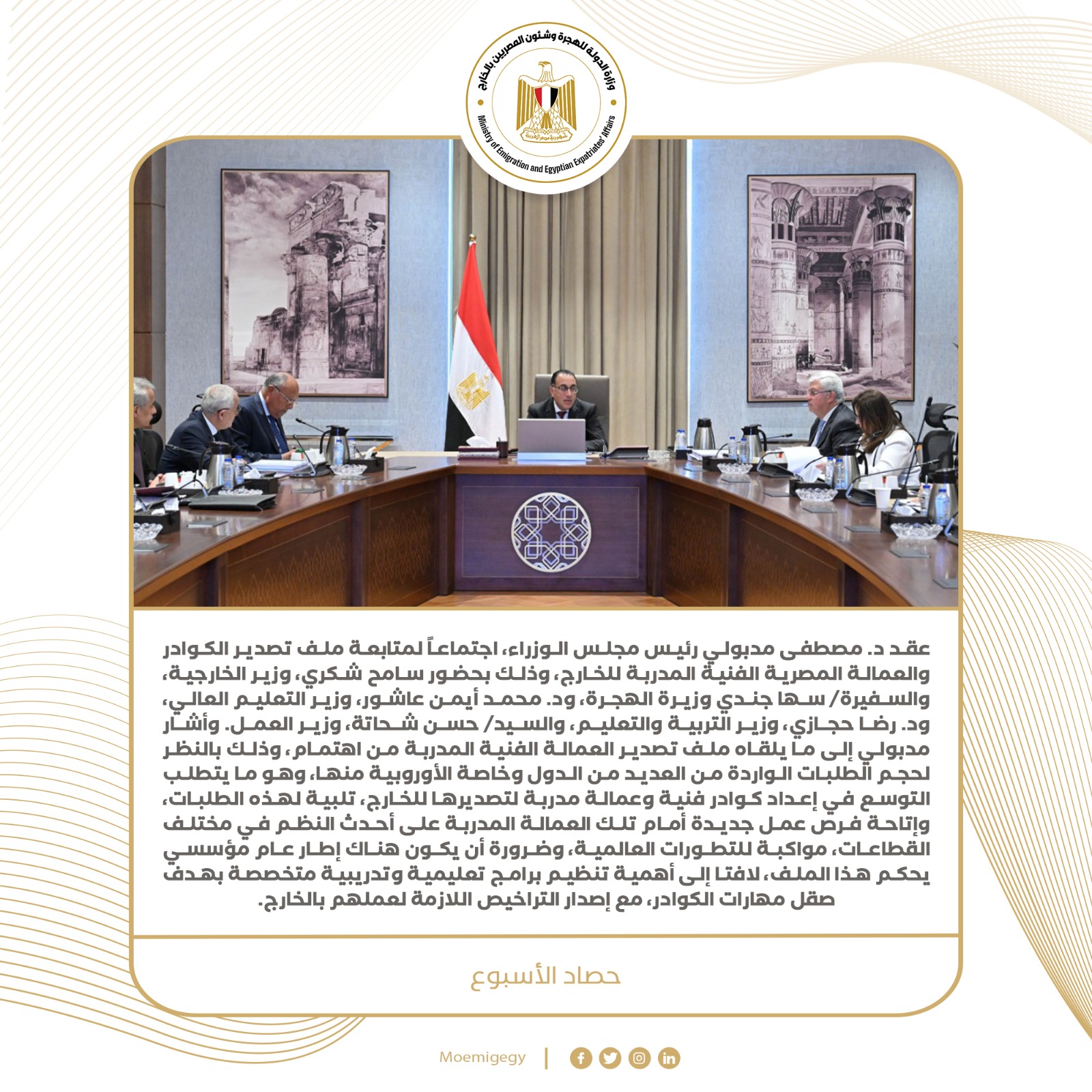 6- عقد د. مصطفى مدبولي رئيس مجلس الوزراء، اجتماعًا لمتابعة ملف تصدير الكوادر والعمالة المصرية الفنية المدربة للخارج، وذلك بحضور سامح شكري، وزير الخارجية، والسفيرة سها جندي وزيرة الهجرة، ود. محمد أيمن عاشور، وزير التعليم العالي، ود. رضا حجازي، وزير التربية والتعليم، وحسن شحاتة، وزير العمل. وأشار مدبولي إلى ما يلقاه ملف تصدير العمالة الفنية المدربة من اهتمام، وذلك بالنظر لحجم الطلبات الواردة من العديد من الدول وخاصة الأوروبية منها، وهو ما يتطلب التوسع في إعداد كوادر فنية وعمالة مدربة لتصديرها للخارج، تلبية لهذه الطلبات، وإتاحة فرص عمل جديدة أمام تلك العمالة المدربة على أحدث النظم في مختلف القطاعات، مواكبة للتطورات العالمية، وضرورة أن يكون هناك إطار عام مؤسسي يحكم هذا الملف، لافتا إلى أهمية تنظيم برامج تعليمية وتدريبية متخصصة بهدف صقل مهارات الكوادر، مع إصدار التراخيص اللازمة لعملهم بالخارج.