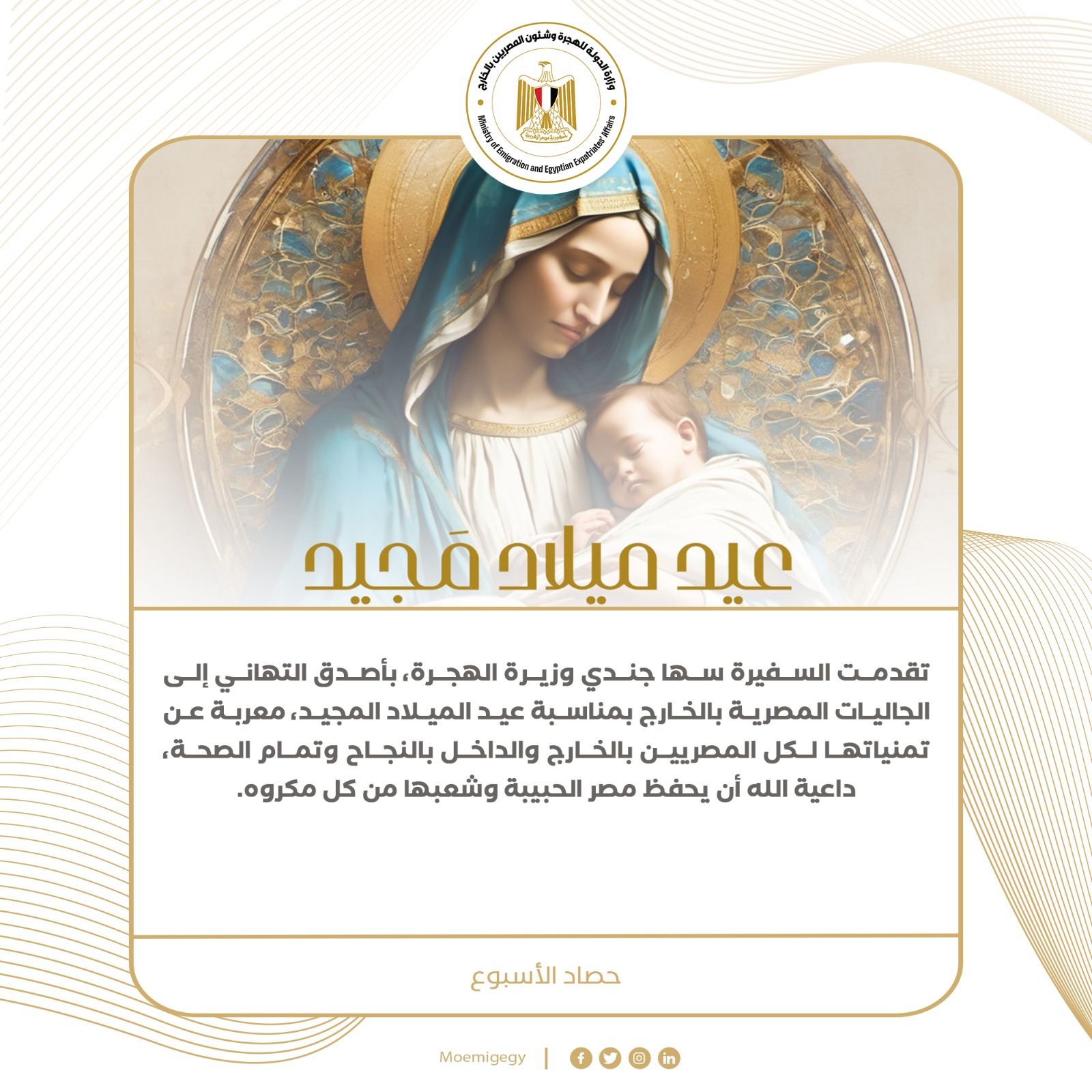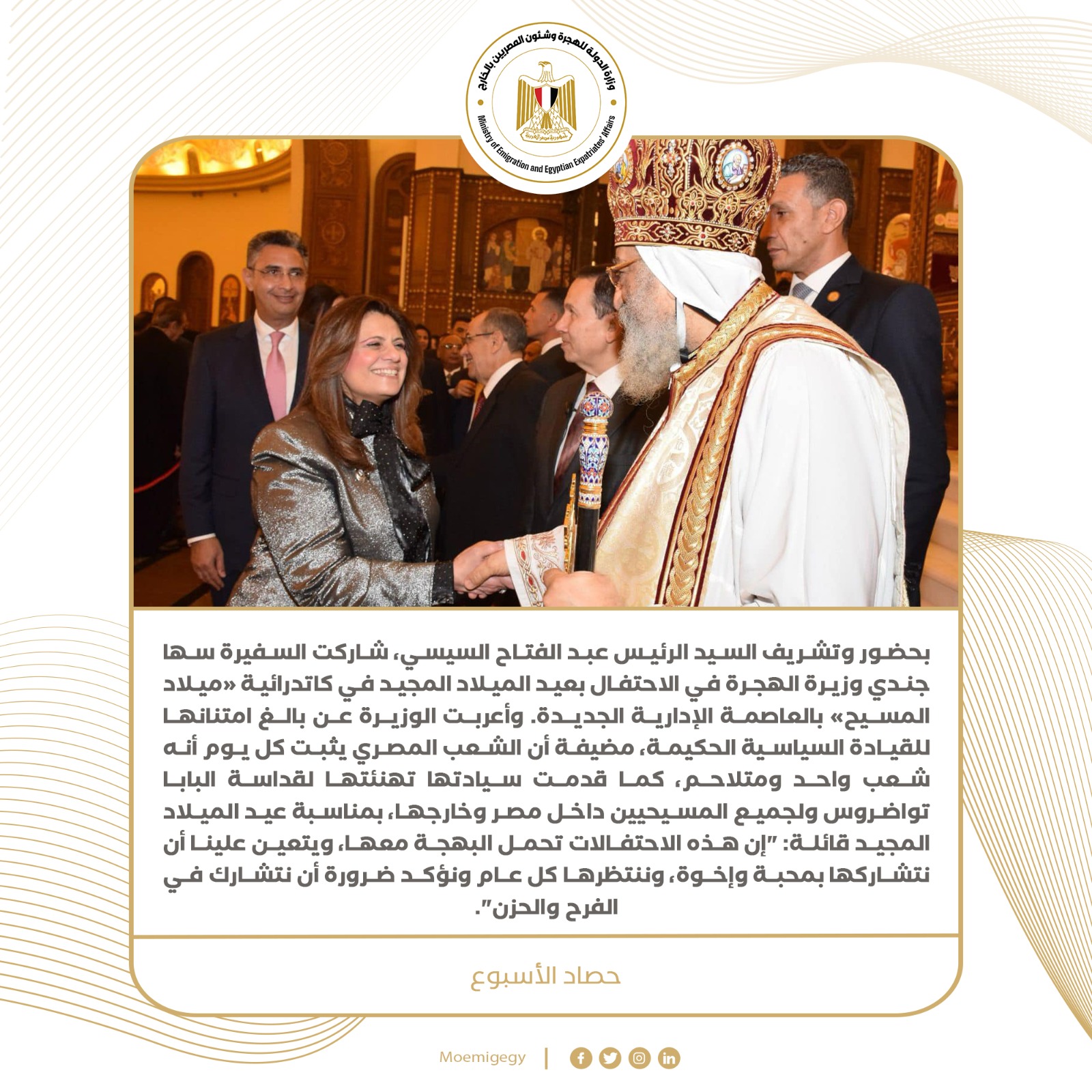 1- تقدمت السفيرة سها جندي وزيرة الهجرة، بأصدق التهاني إلى الجاليات المصرية بالخارج بمناسبة عيد الميلاد المجيد، معربة عن تمنياتها لكل المصريين بالخارج والداخل بالنجاح وتمام الصحة، داعية الله أن يحفظ مصر الحبيبة وشعبها من كل مكروه.