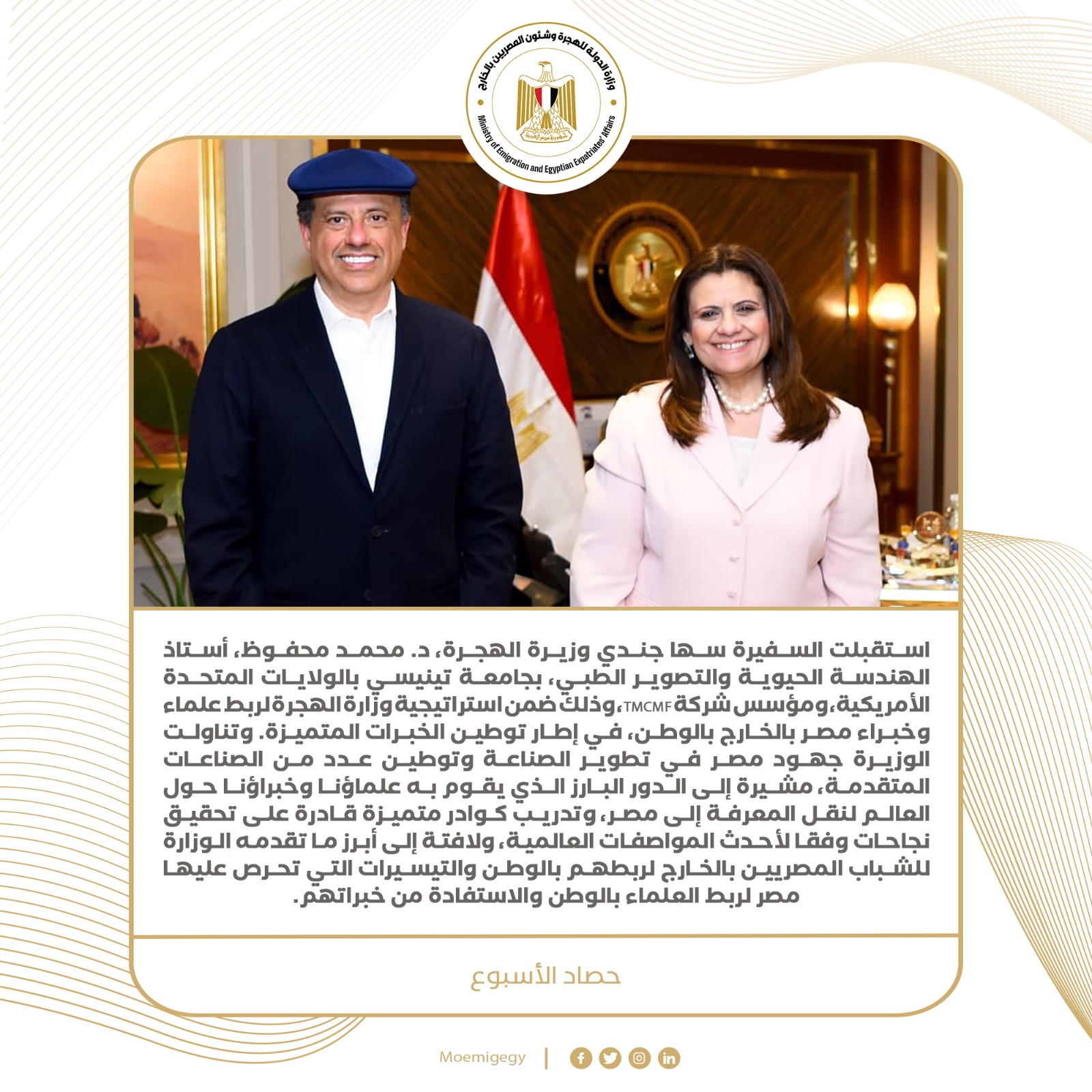 7- استقبلت السفيرة سها جندي وزيرة الهجرة، د. محمد محفوظ، أستاذ الهندسة الحيوية والتصوير الطبي، بجامعة تينيسي بالولايات المتحدة الأمريكية، ومؤسس شركة TMCMF، وذلك ضمن استراتيجية وزارة الهجرة لربط علماء وخبراء مصر بالخارج بالوطن، في إطار توطين الخبرات المتميزة. وتناولت الوزيرة جهود مصر في تطوير الصناعة وتوطين عدد من الصناعات المتقدمة، مشيرة إلى الدور البارز الذي يقوم به علماؤنا وخبراؤنا حول العالم لنقل المعرفة إلى مصر، وتدريب كوادر متميزة قادرة على تحقيق نجاحات وفقا لأحدث المواصفات العالمية، ولافتة إلى أبرز ما تقدمه الوزارة للشباب المصريين بالخارج لربطهم بالوطن والتيسيرات التي تحرص عليها مصر لربط العلماء بالوطن والاستفادة من خبراتهم.