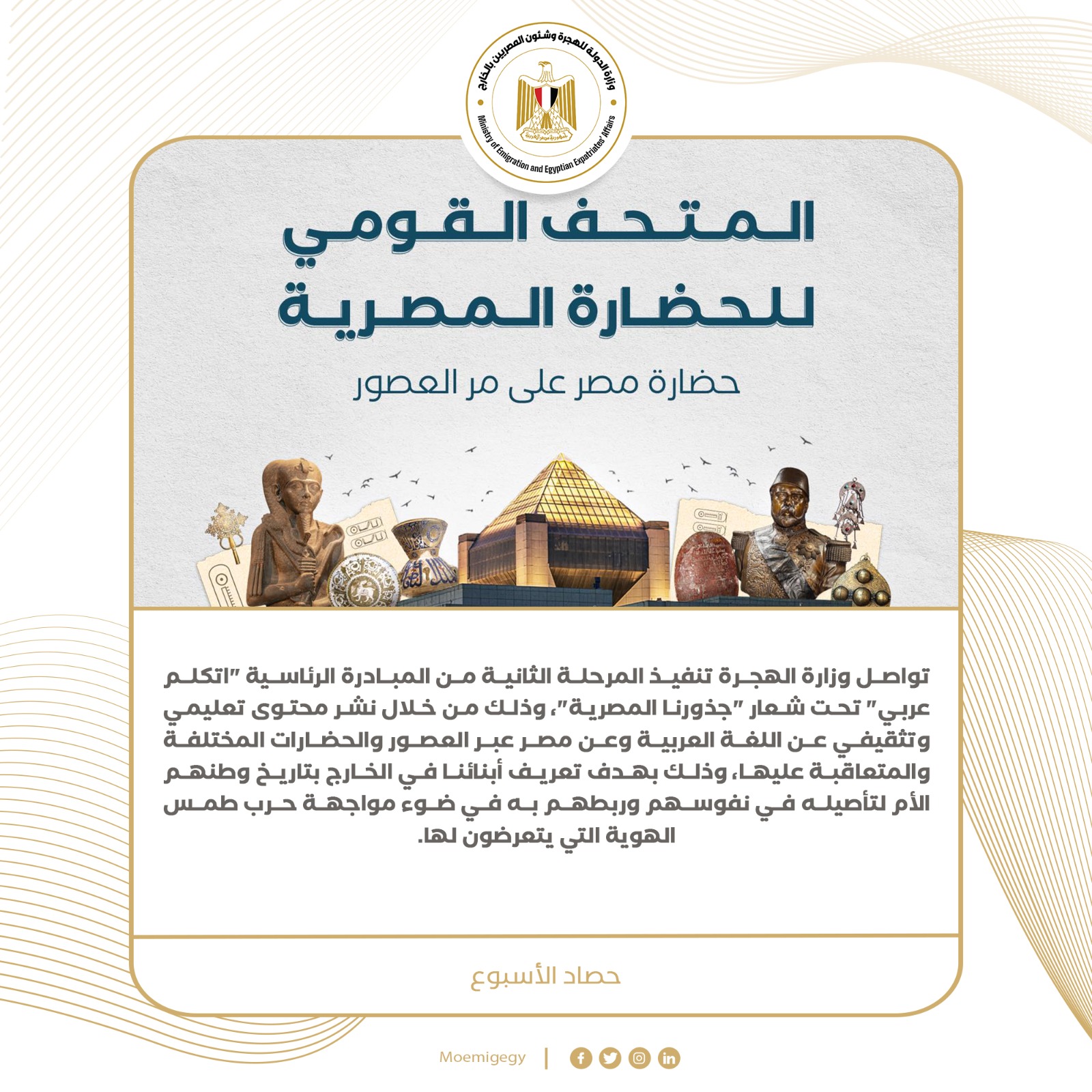 13- تواصل وزارة الهجرة تنفيذ المرحلة الثانية من المبادرة الرئاسية "اتكلم عربي" تحت شعار "جذورنا المصرية"، وذلك من خلال نشر محتوى تعليمي وتثقيفي عن اللغة العربية وعن مصر عبر العصور والحضارات المختلفة والمتعاقبة عليها، وذلك بهدف تعريف أبنائنا في الخارج بتاريخ وطنهم الأم لتأصيله في نفوسهم وربطهم به في ضوء مواجهة حرب طمس الهوية التي يتعرضون لها.