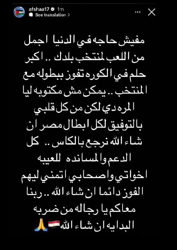 ونشر ستوري عبر حسابه الرسمي على إنستجرام كتب خلاله: "مفيش حاجه في الدنيا أجمل من اللعب لمنتخب بلدك، أكبر حلم في الكوره تفوز ببطولة مع المنتخب، يمكن مش مكتوبه ليا المره دي لكن من كل قلبي بالتوفيق لكل أبطال مصر أن شاء الله نرجع بالكأس، كل الدعم والمساندة للاعبين اتمني ليهم الفوز دائما إن شاء الله".