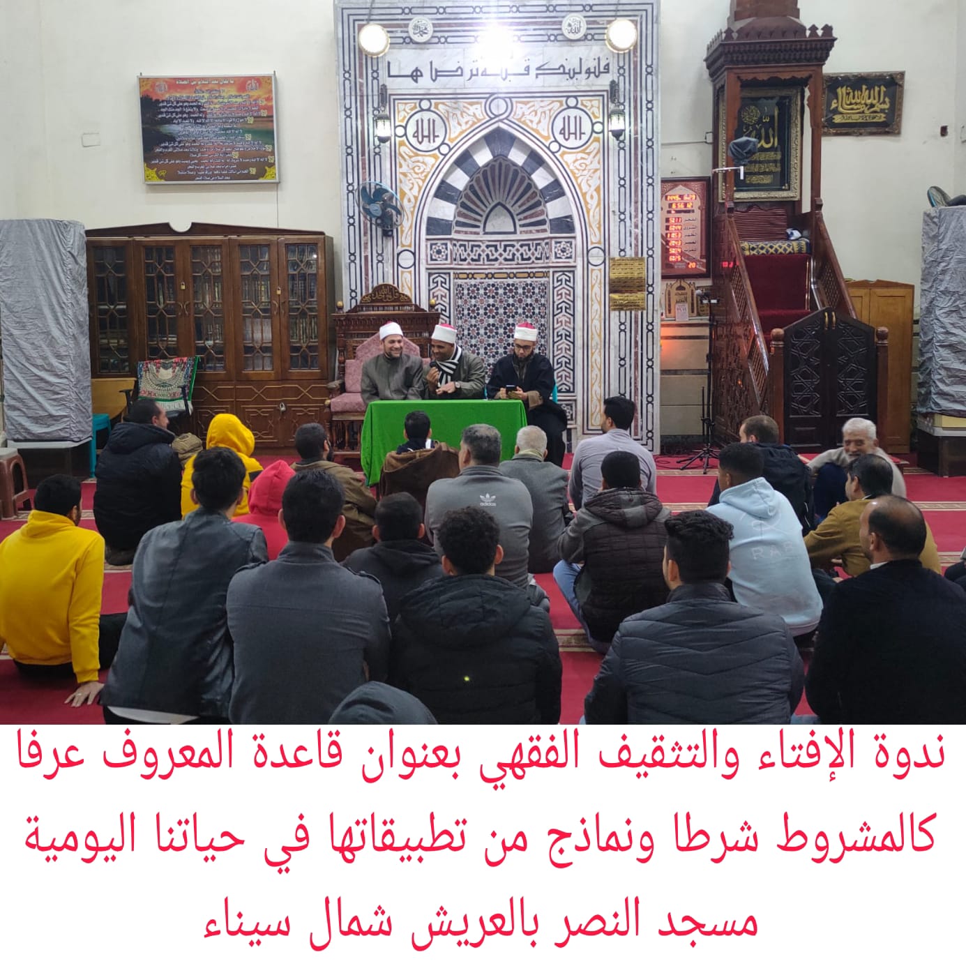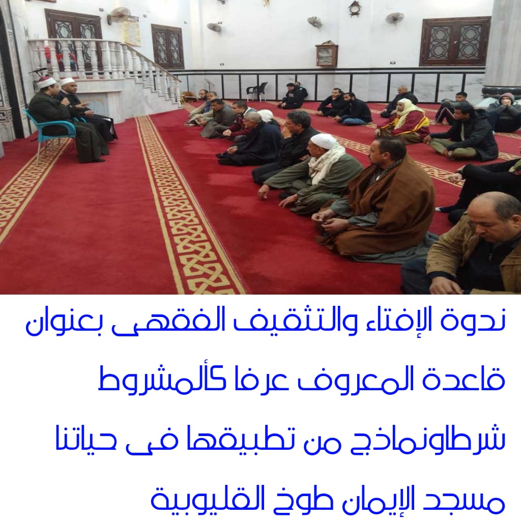 أقامت وزارة الأوقاف مساء أمس، بعد صلاة العشاء: "ندوات الإفتاء والتثقيف الفقهي" حول موضوع: "المعروف عرفا كالمشروط شرطًا".