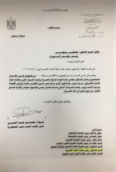 وضم القرار تشكيل مجلس إدارة هيئة الدواء المصرية كالتالي:
