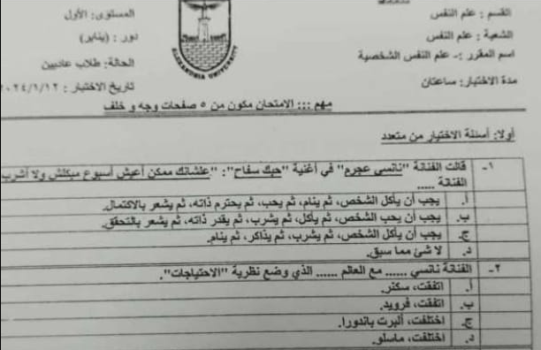 امتحان أداب الإسكندرية، آثار امتحان علم النفس بكلية الآداب، جامعة الإسكندرية، جدلًا واسعًا وتفاعلا بين نشطاء مواقع التواصل الاجتماعي، وخاصة أن الامتحان جاء فيه سؤالان، إحداهما عن أغنية الفنانة اللبنانية نانسي عجرم "حبك سفاح"، والثاني عن أغنية الفنانة إليسا "حالة حب".