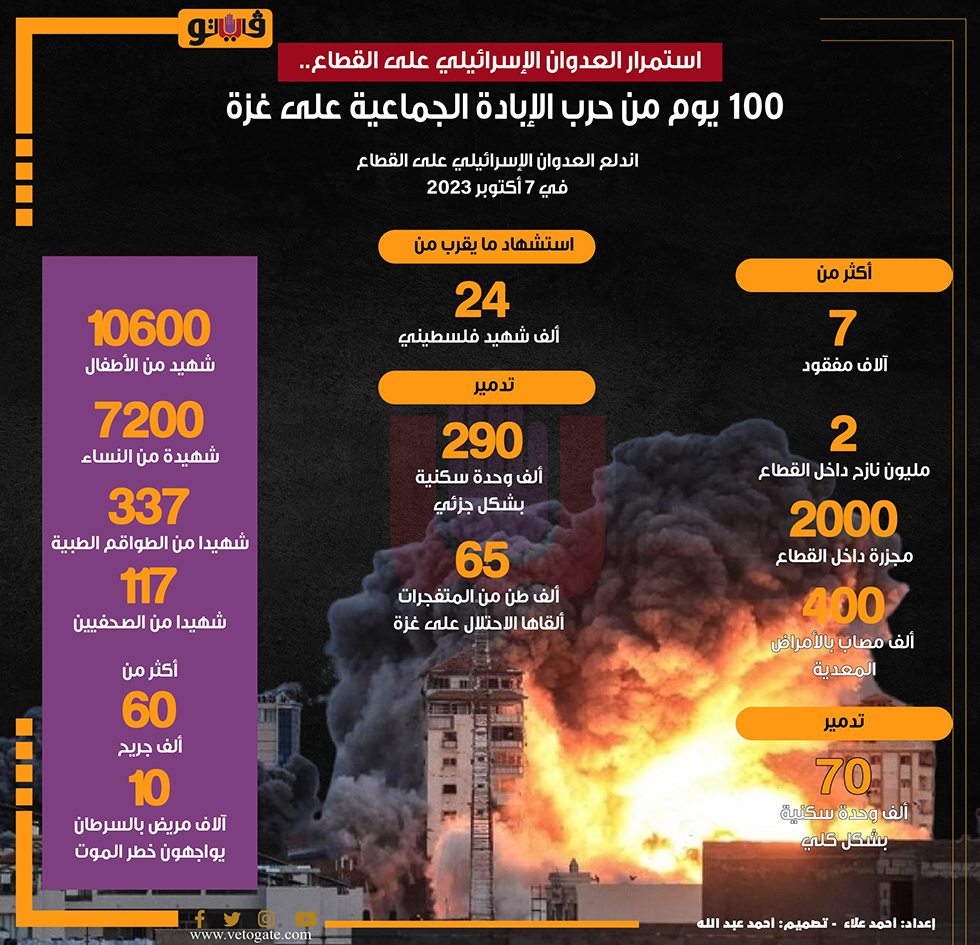 استمرار العدوان الإسرائيلي على القطاع.. 100 يوم من حرب الإبادة الجماعية على غزة (إنفوجراف) الأحد 14/يناير/2024 - 07:38 م 1/14/2024 7:38:32 PM غزة، فيتو احمد علاء شارك طباعة 18 حجم الخط شارك طباعة العدوان الاسرائيلي علي غزة 100 يوم من العدوان الإسرائيلي على غزة قطاع غزة حصيلة ضحايا العدوان الإسرائيلي على غزة ضحايا العدوان الإسرائيلي على القطاع