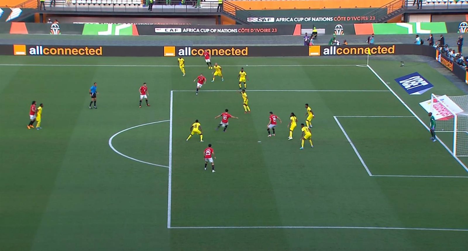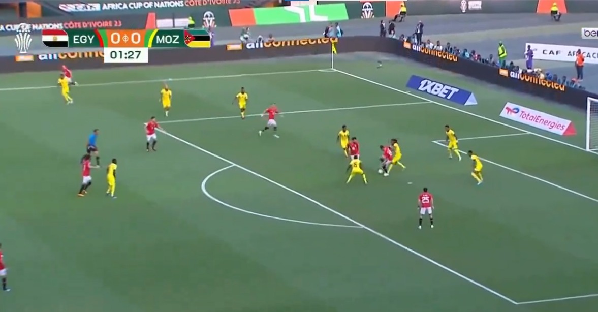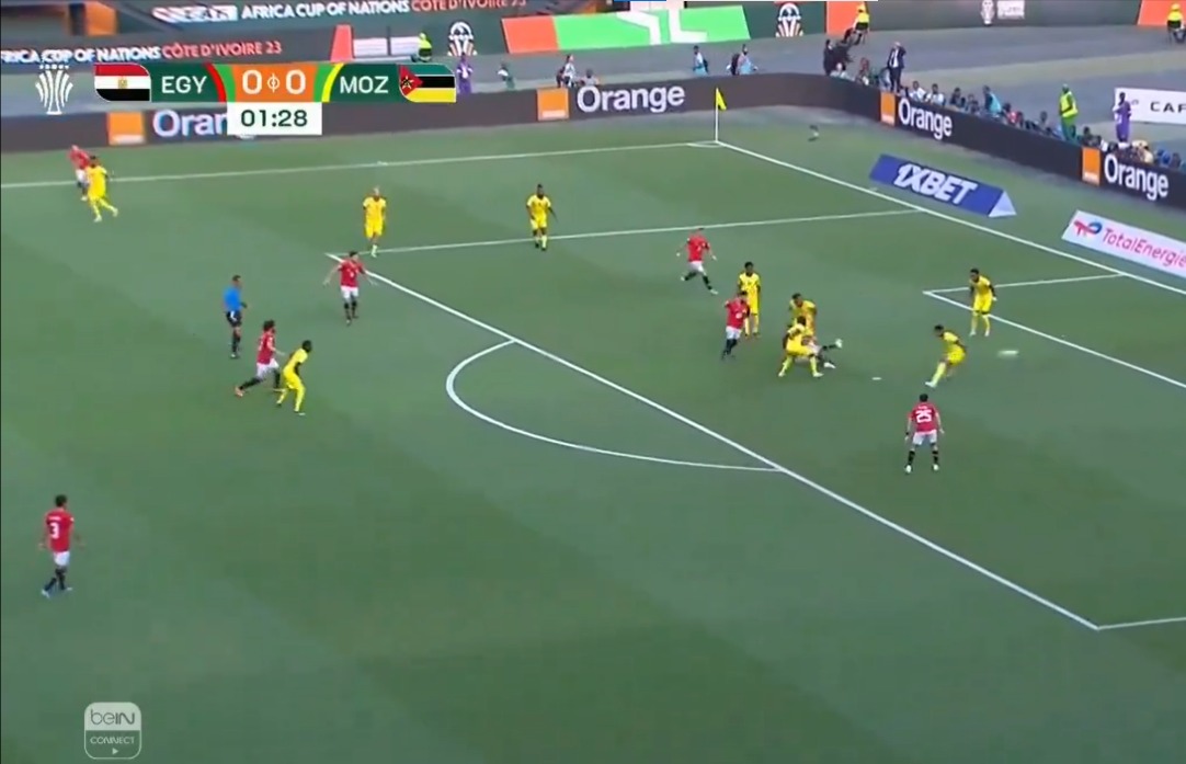وواصل المنتخب المصري ضغطه لخطف هدف ثاني وسط صمود من دفاع موزمبيق، وتصدت العارضة لكرة تريزيجيه لاعب منتخب مصر في الدقيقة 25.