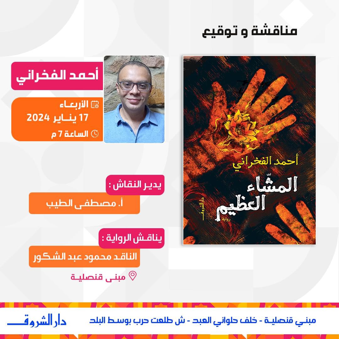تنظم دار الشروق للنشر والتوزيع ندوة لمناقشة وتوقيع رواية "المشاء العظيم" للكاتب والروائي أحمد الفخراني، وذلك في تمام السابعة من مساء يوم الأربعاء المقبل الموافق 17 يناير الجاري، بمبنى قنصليه بوسط القاهرة.
