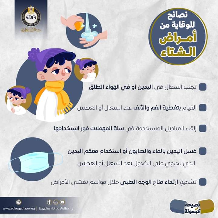 وجهت هيئة الدواء المصرية نصائح للوقاية من أمراض الشتاء أهمها ضرورة اتباع الطرق السليمة وآداب العطس والسعال.