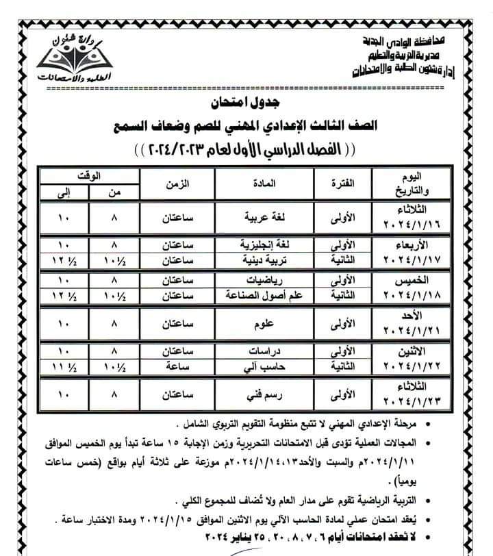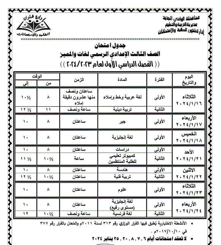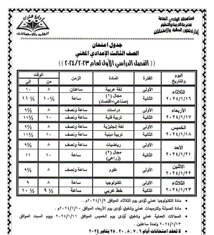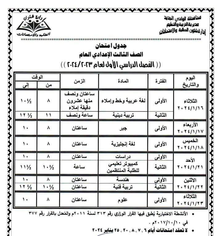أعلنت مديرية التربية والتعليم بمحافظة الوادي الجديد، اليوم الإثنين، جاهزية جميع اللجان لاستقبال طلاب الشهادة الإعدادية، حيث يستعد طلاب الشهادة الإعدادية بالمحافظة لانطلاق امتحانات الفصل الدراسي الأول للعام الدراسي 2023/2024، حيث تبدأ امتحاناتهم اعتبارًا من غدًا الثلاثاء الموافق 16 يناير، وتستمر حتى الثلاثاء 23 يناير 2024، وذلك وفقًا للجداول الامتحانية التي تم الإعلان عنها مسبقًا.