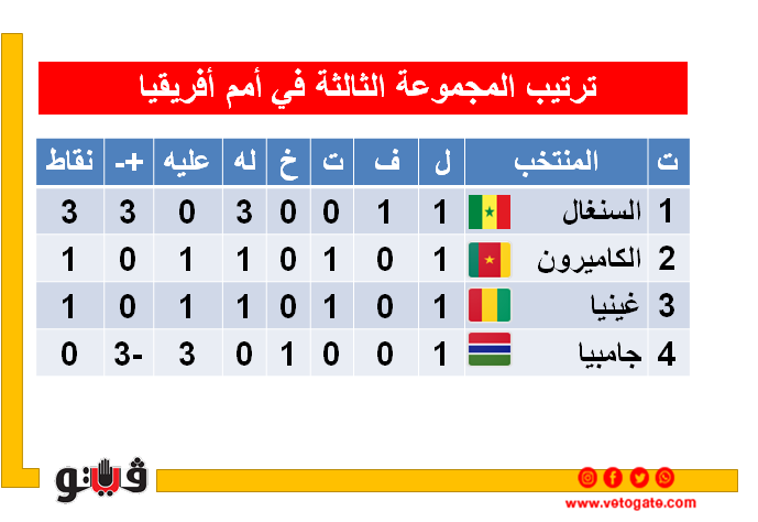 جدول ترتيب مجموعة السنغال والكاميرون بعد الجولة الأولى