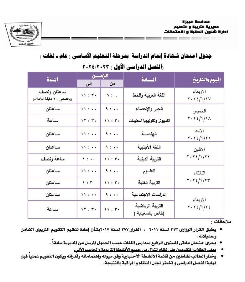 وجاء جدول امتحانات الفصل الدراسي الأول لطلاب الشهادة الإعدادية بالجيزة، حسب ما أعلنت مديرية التربية والتعليم بالجيزة على النحو التالي: