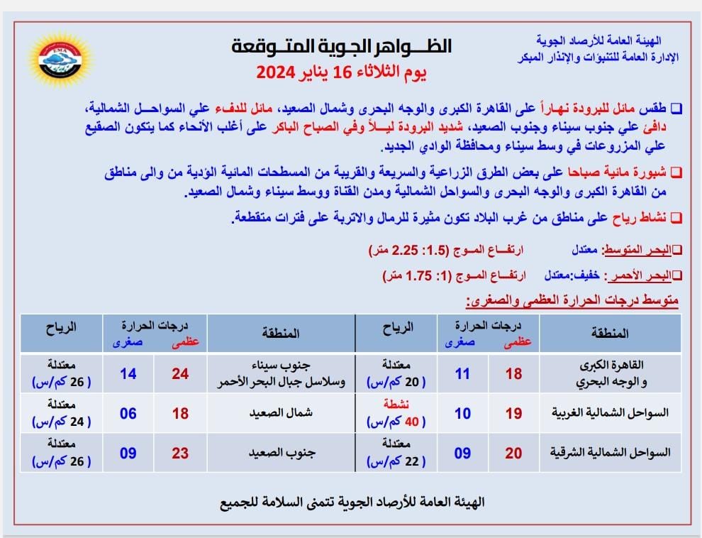وقالت الأرصاد الجوية، في نشرتها إن اليوم الثلاثاء يسود طقس مائل للبرودة نهارًا على القاهرة الكبرى والوجه البحري وشمال الصعيد، مائل للدفء على السواحل الشمالية، دافئ على جنوب سيناء وجنوب الصعيد، بينما يسود طقس طقس شديدة البرودة ليلا وفي الصباح الباكر على أغلب الأنحاء، كما يتكون الصقيع على المزروعات في وسط سيناء ومحافظة الوادي الجديد.