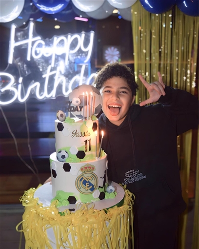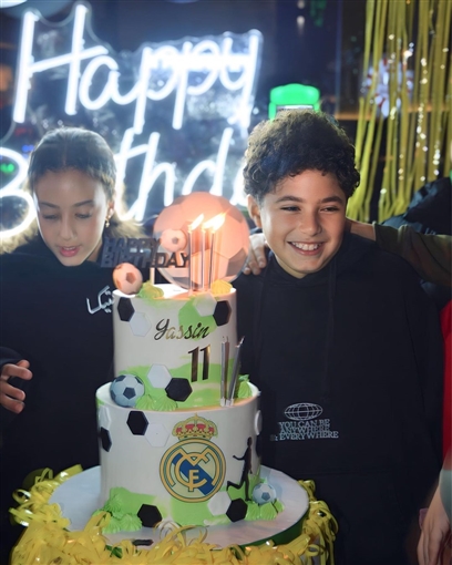 وظهر ياسين وسط أصدقائه وخالته وأمامه قالب حلوى مكتوب عليه رقم 11 إذا بلغ من العمر 11 عاما، ومرسوم عليه كرة وشعار نادي ريال مدريد الإسباني الذي يشجعه.
