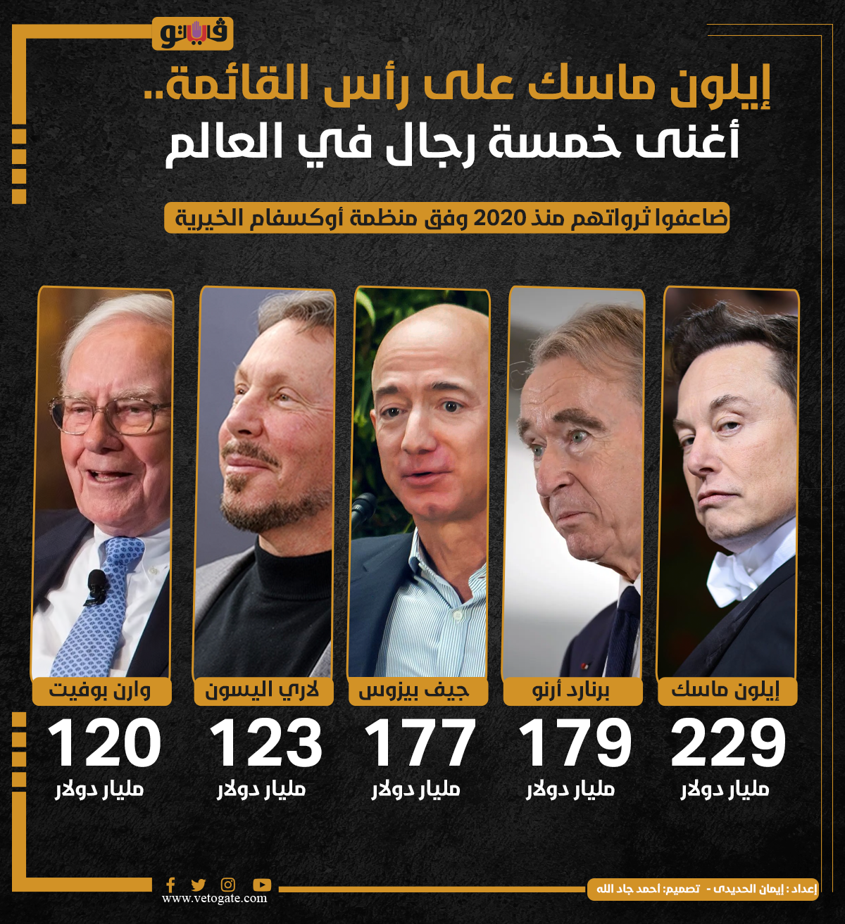 إيلون ماسك على رأس القائمة.. أغنى خمسة رجال في العالم | إنفوجراف الأربعاء 17/يناير/2024 - 10:52 ص 1/17/2024 10:52:08 AM ايلون ماسك، فيتو إيمان الحديدى شارك طباعة 18 حجم الخط شارك طباعة منظمة اوكسفام جيف بيزوس إيلون ماسك اوكسفام لاري أليسون برنارد ارنو