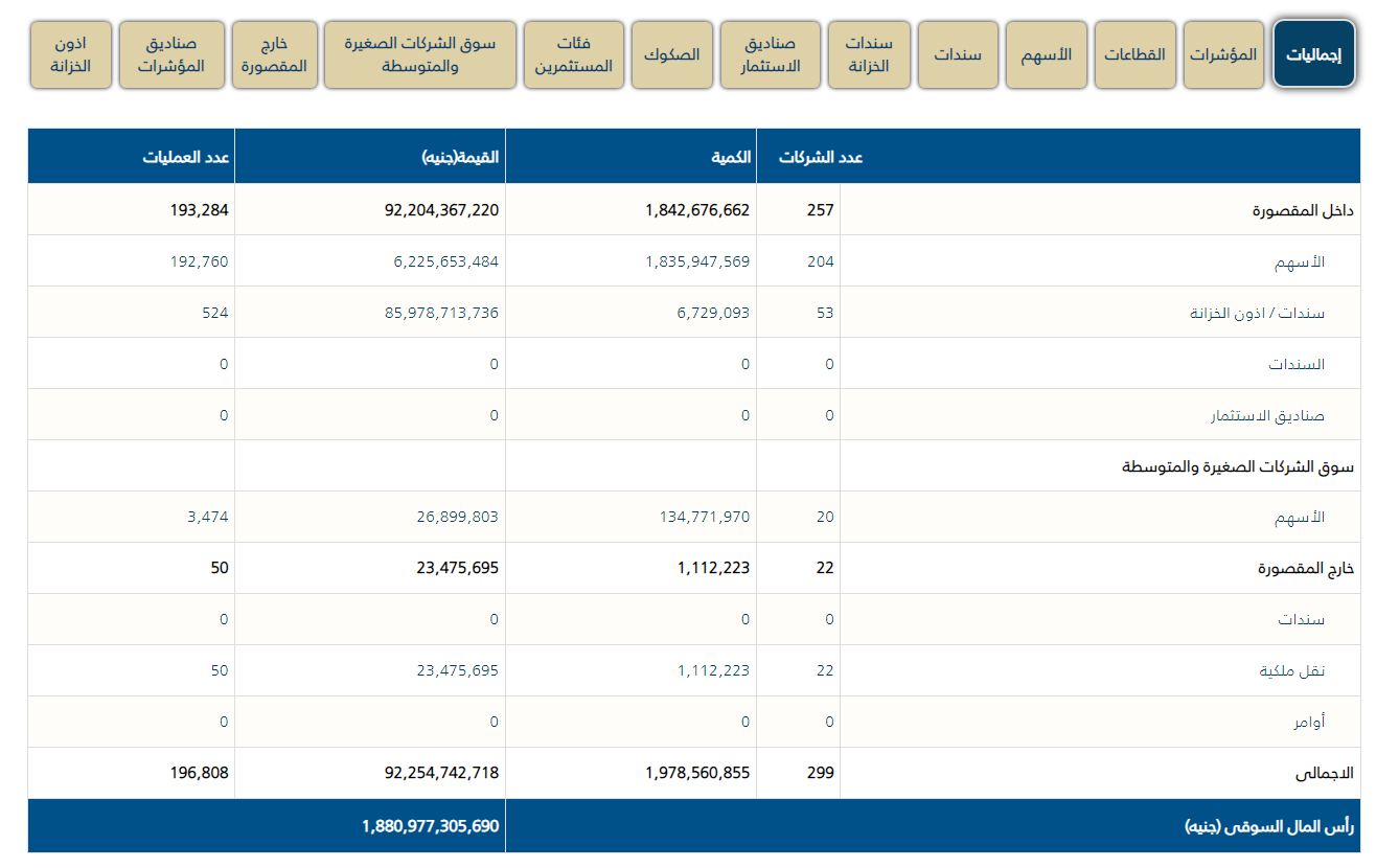 كما صعد مؤشر الشركات الصغيرة والمتوسطة "إيجي إكس 70 متساوي الأوزان" بنسبة 1.23 % عند مستوى 6.297.55 نقطة، وصعد مؤشر "إيجي إكس 100 متساوي الأوزان" بنسبة 1.00 % عند مستوى 8949.02 نقطة.