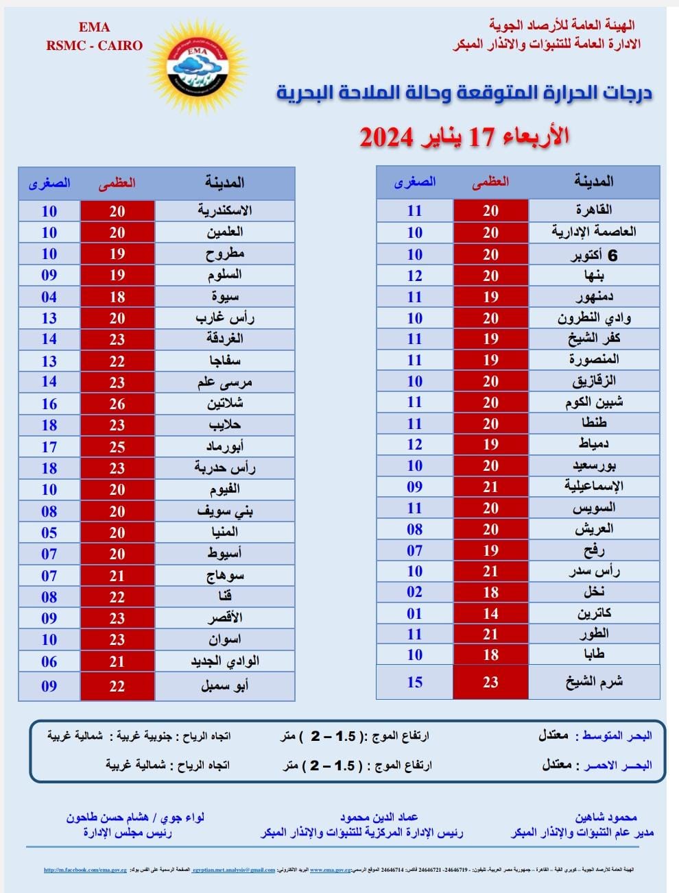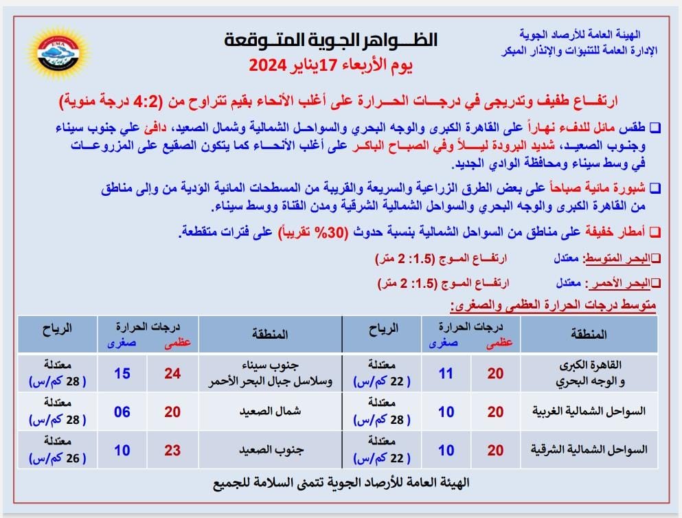 وقالت هيئة الأرصاد الجوية عبر حسابها على موقع التواصل الاجتماعي "فيس بوك"، إنه من المتوقع أن يسود طقس مائل للدفء نهارا على شمال البلاد حتى شمال الصعيد دافئ على جنوب الصعيد وجنوب سيناء.