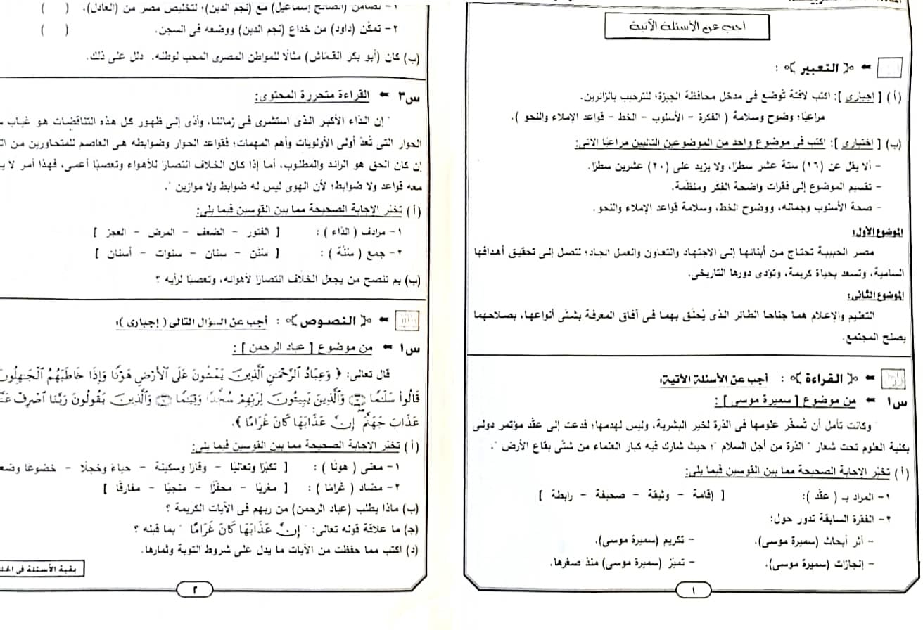 الشهادة الإعدادية 2024، نموذج الإجابة الرسمي لامتحان اللغة العربية بالجيزة