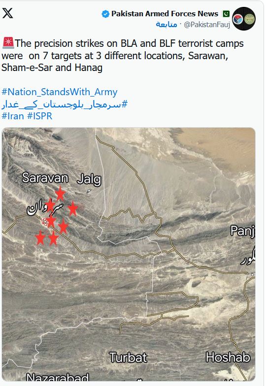 كما نشر الحساب الرسمي للجيش الباكستاني على منصة "إكس" تغريدة تتضمن مواقع الأهداف التي قصفتها داخل إيران، معلقًا: "تم توجيه ضربات دقيقة على معسكرات تنظيمات "BLA" و"BLF" الإرهابية، استهدفت 7 مواقع في 3 مناطق مختلفة".