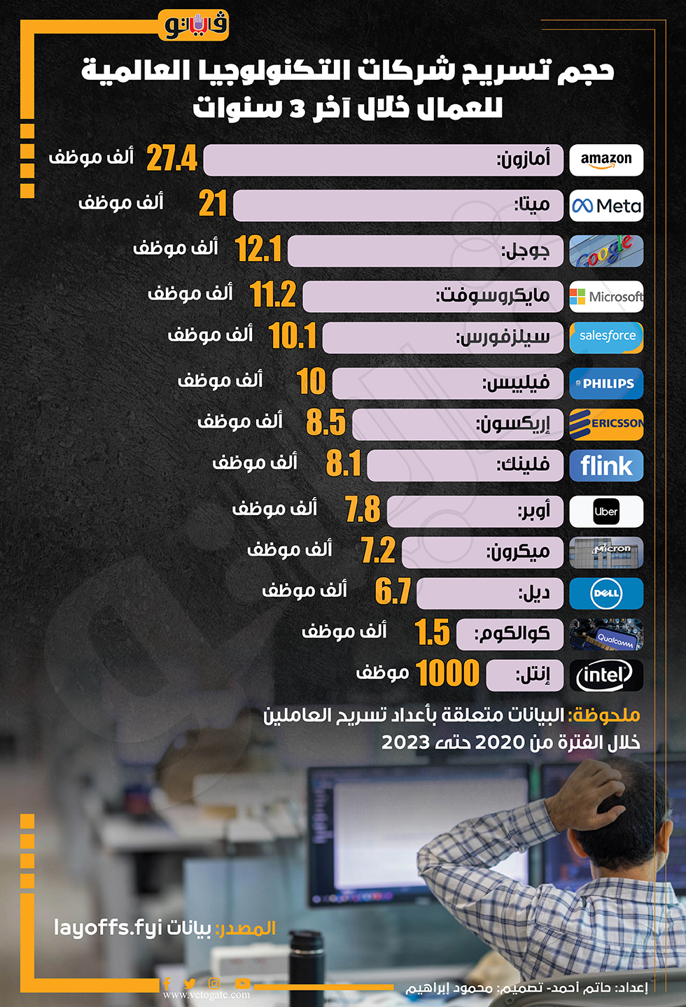 حجم تسريح شركات التكنولوجيا العالمية للعمال خلال آخر 3 سنوات (إنفوجراف) الخميس 18/يناير/2024 - 12:41 م 1/18/2024 12:41:14 PM تسريح العاملين، فيتو حاتم أحمد شارك طباعة 18 حجم الخط شارك طباعة شركات التكنولوجيا تسريح شركات التكنولوجيا العالمية للعمال امازون ميتا مايكروسوفت