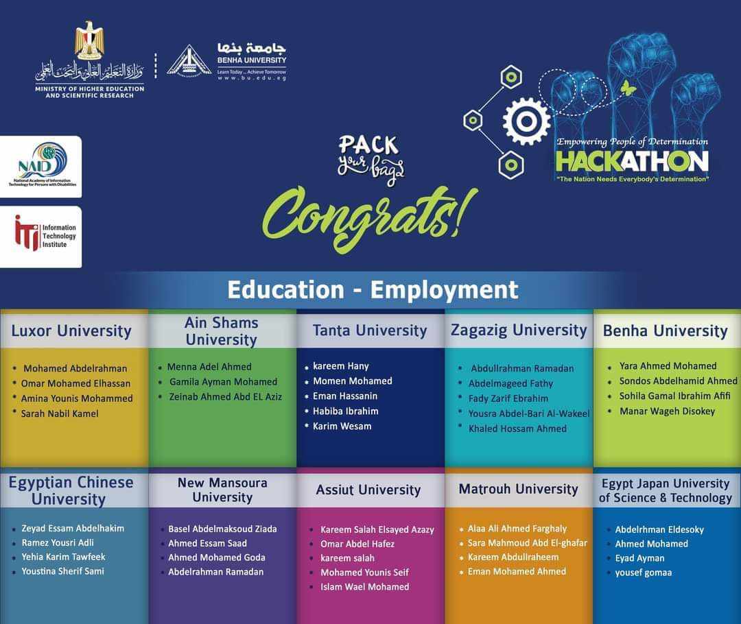 أعلنت جامعة بنها القائمة القصيرة للفرق المشاركة في فعاليات هاكاثون التقنيات الناشئة لتمكين ذوي الهمم في التعليم والتوظيف والذي ينطلق 11 فبراير المقبل.