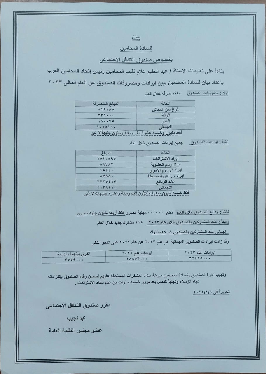 المحامين تناشد المشتركين بصندوق التكافل سداد الاشتراكات قبل نهاية 2024