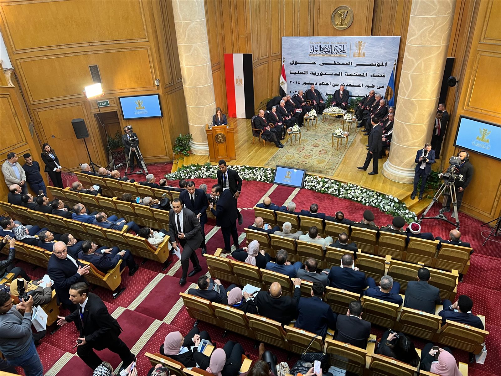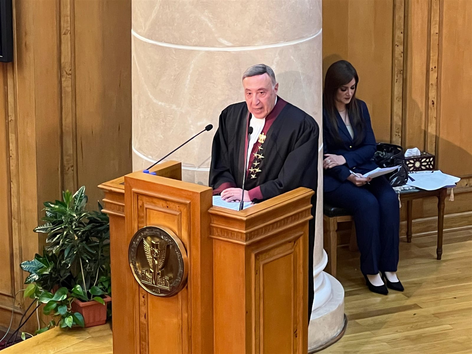 وأوضح رئيس المحكمة الدستورية العليا إنه كانَ لِحرِصِ القيادةِ السياسيةِ وَوَعِيها بأهميةِ إعلاءِ القيمِ الدستوريةِ، وتعميقِ مبادئِ الدولةِ القانونيةِ، ودعمِها لإعلامِ الداخلِ والخارجِ، باستواءِ الدولةِ المصريةِ على مدارجِ الشرعيةِ الدستوريةِ، أثرُهُ الأكيدُ في إلهامِ الجمعيةِ العامةِ للمحكمةِ الدستوريةِ العليا، بتفويضِي لأُحَدثَكم حَديثًا موثقًا، عنْ تفعيلِ وإنفاذِ أحكامِ وقراراتِ هذهِ المحكمةِ، للمبادئِ الِتي استحدَثَتْها الوثيقةُ الدستوريةُ القائمةُ، التِي تقبلُ دومًا تطويرًا وتعديلًا، يتوافقُ معَ اعتبارِها وثيقةً تقدميةً تسعَىٰ لتحقيقِ المصلحةِ الفضلَى للدولةِ والمواطنِ معًا.