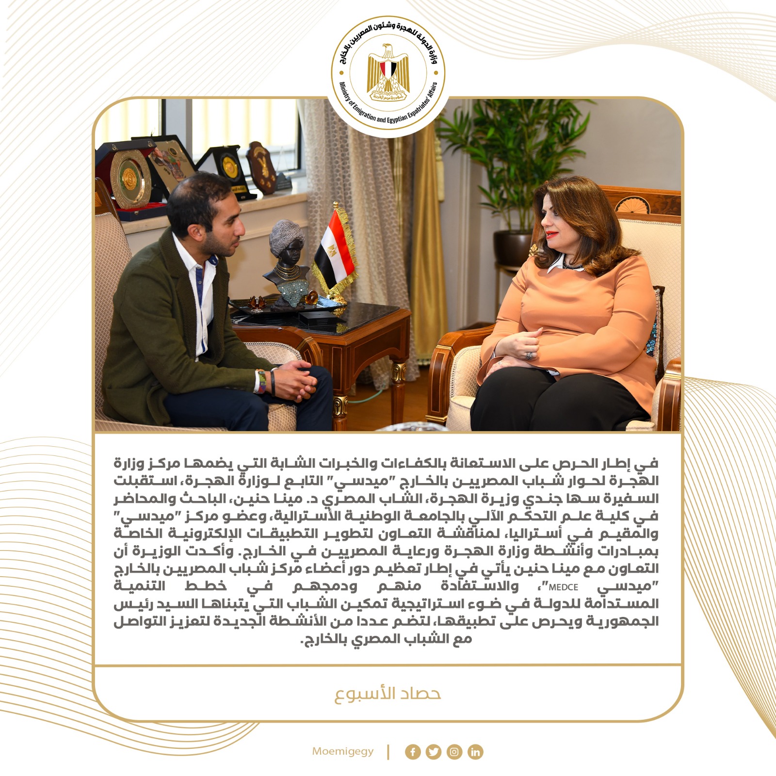 6- في إطار الحرص على الاستعانة بالكفاءات والخبرات الشابة التي يضمها مركز وزارة الهجرة لحوار شباب المصريين بالخارج "ميدسي" التابع لوزارة الهجرة، استقبلت السفيرة سها جندي وزيرة الهجرة، الشاب المصري مينا حنين، الباحث والمحاضر في كلية علم التحكم الآلي بالجامعة الوطنية الأسترالية، وعضو مركز "ميدسي" والمقيم في أستراليا، لمناقشة التعاون لتطوير التطبيقات الإلكترونية الخاصة بمبادرات وأنشطة وزارة الهجرة ورعاية المصريين في الخارج.