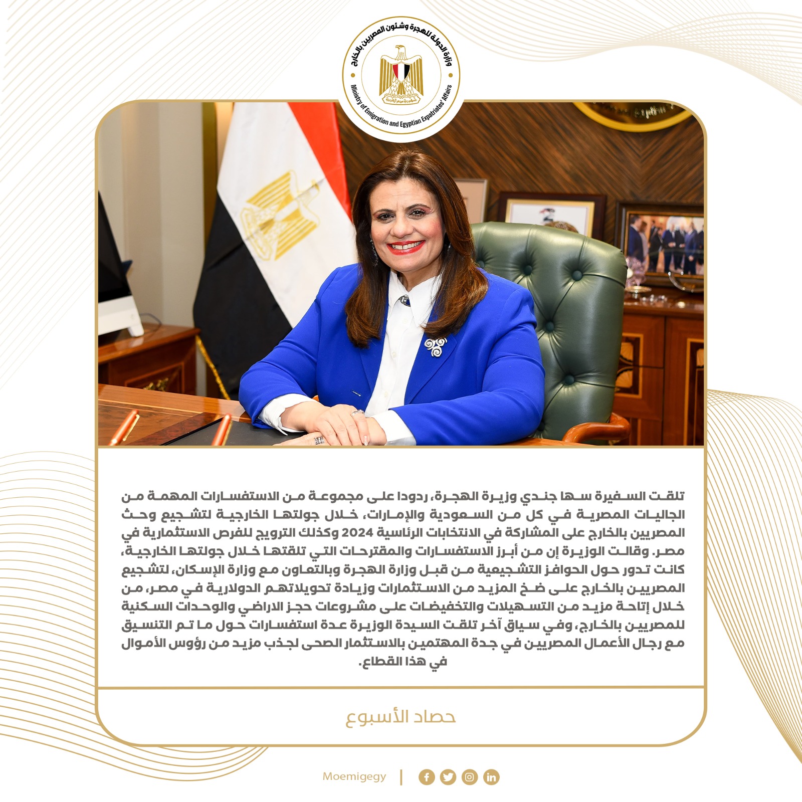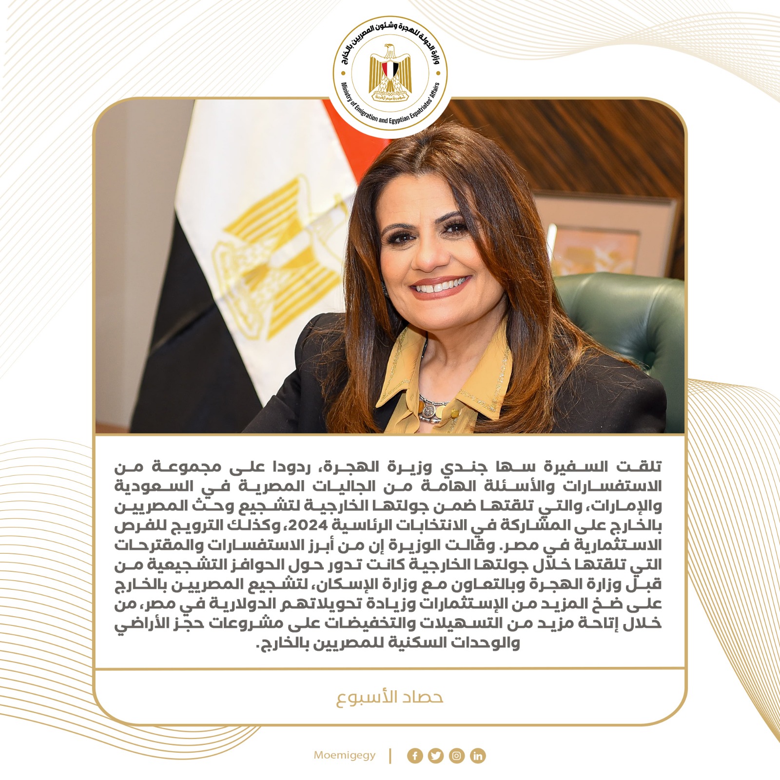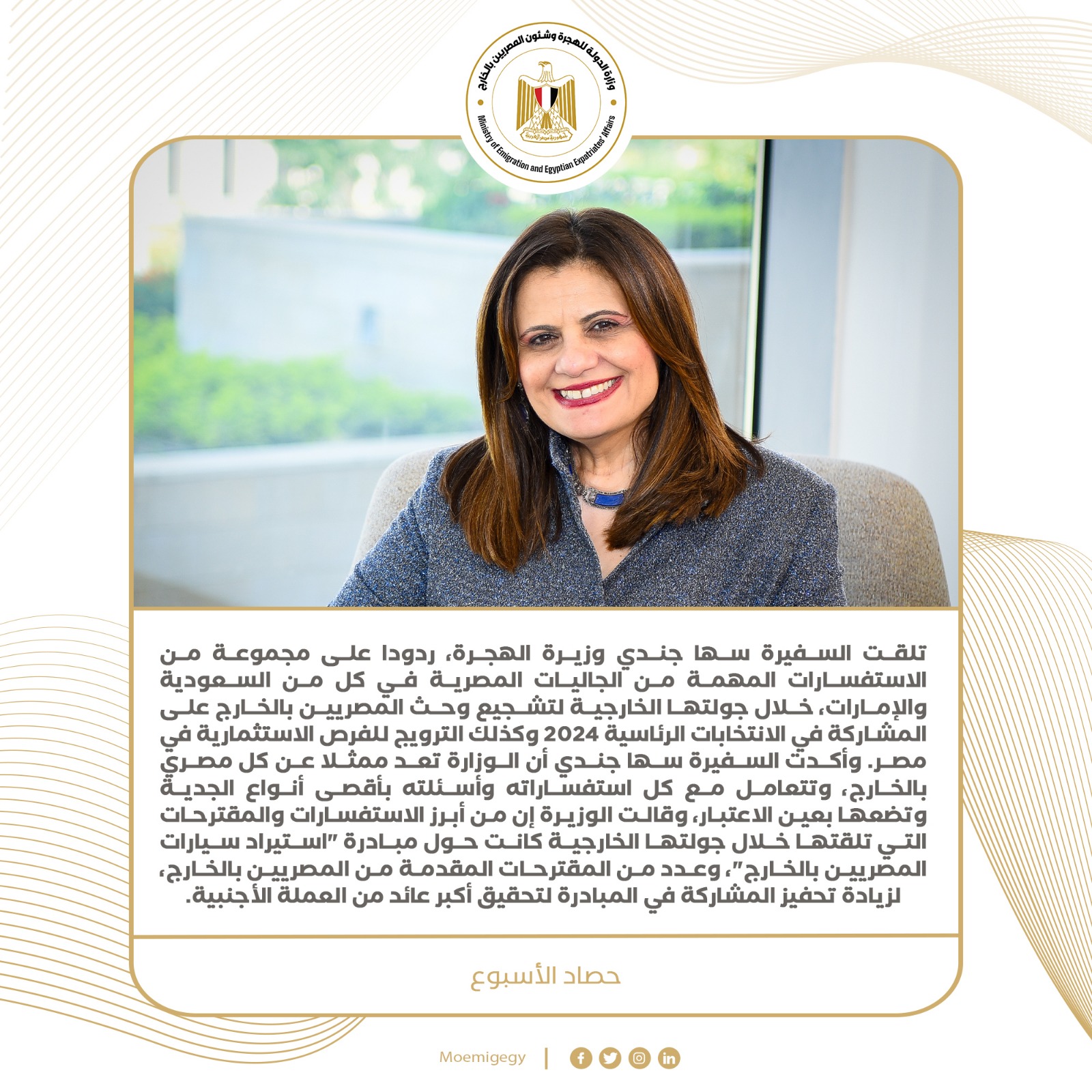 4- تلقت السفيرة سها جندي وزيرة الهجرة، ردودا على مجموعة من الاستفسارات المهمة من الجاليات المصرية في كل من السعودية والإمارات، خلال جولتها الخارجية لتشجيع وحث المصريين بالخارج على المشاركة في الانتخابات الرئاسية 2024 وكذلك الترويج للفرص الاستثمارية في مصر.