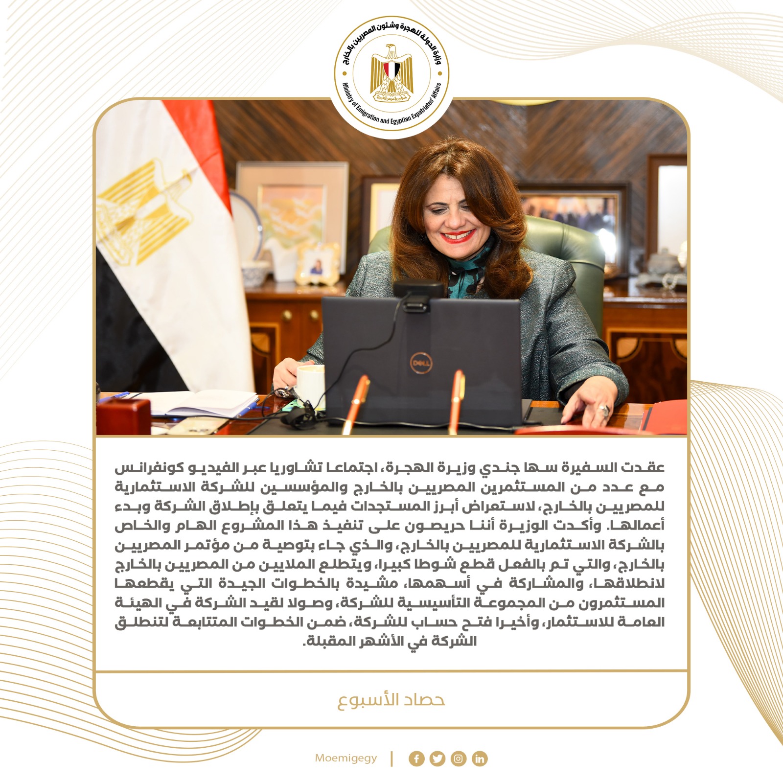 5- عقدت السفيرة سها جندي وزيرة الهجرة، اجتماعا تشاوريا عبر الفيديو كونفرانس مع عدد من المستثمرين المصريين بالخارج والمؤسسين للشركة الاستثمارية للمصريين بالخارج، لاستعراض أبرز المستجدات فيما يتعلق بإطلاق الشركة وبدء أعمالها.