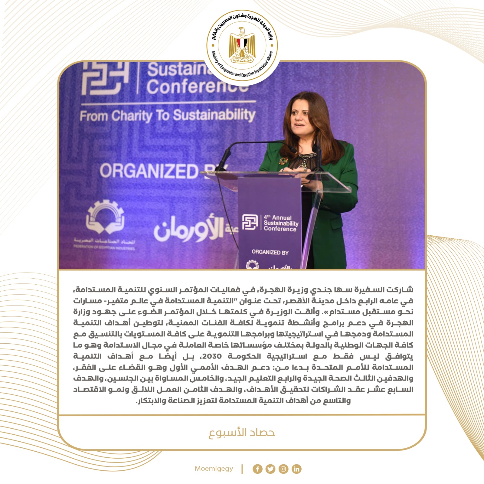 1- شاركت السفيرة سها جندي وزيرة الهجرة، في فعاليات المؤتمر السنوي للتنمية المستدامة، في عامه الرابع داخل مدينة الأقصر، تحت عنوان "التنمية المستدامة في عالم متغير- مسارات نحو مستقبل مستدام». وألقت الوزيرة في كلمتها خلال المؤتمر الضوء على جهود وزارة الهجرة في دعم برامج وأنشطة تنموية لكافة الفئات المعنية، لتوطين أهداف التنمية المستدامة ودمجها في استراتيجيتها وبرامجها التنموية على كافة المستويات بالتنسيق مع كافة الجهات الوطنية بالدولة بمختلف مؤسساتها خاصة العاملة في مجال الاستدامة وهو ما يتوافق ليس فقط مع استراتيجية الحكومة 2030، بل أيضا مع أهداف التنمية المستدامة للأمم المتحدة بدءا من: دعم الهدف الأممي الأول وهو القضاء على الفقر، والهدفين الثالث الصحة الجيدة والرابع التعليم الجيد، والخامس المساواة بين الجنسين، والهدف السابع عشر عقد الشراكات لتحقيق الأهداف، والهدف الثامن العمل اللائق ونمو الاقتصاد والتاسع من أهداف التنمية المستدامة لتعزيز الصناعة والابتكار.