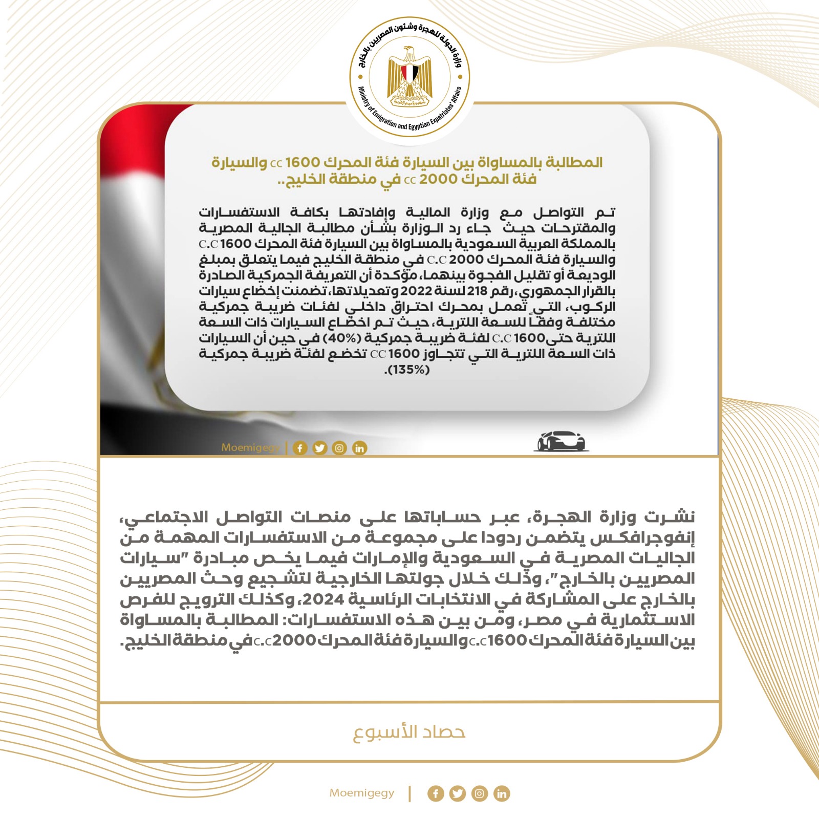 9- نشرت وزارة الهجرة، عبر حساباتها على منصات التواصل الاجتماعي، إنفوجرافكس يتضمن ردودا على مجموعة من الاستفسارات المهمة من الجاليات المصرية في السعودية والإمارات فيما يخص مبادرة "سيارات المصريين بالخارج"، وذلك خلال جولتها الخارجية لتشجيع وحث المصريين بالخارج على المشاركة في الانتخابات الرئاسية 2024، وكذلك الترويج للفرص الاستثمارية في مصر، ومن بين هذه الاستفسارات: المطالبة بالمساواة بين السيارة فئة المحرك 1600 C.C والسيارة فئة المحرك 2000 C.C في منطقة الخليج.