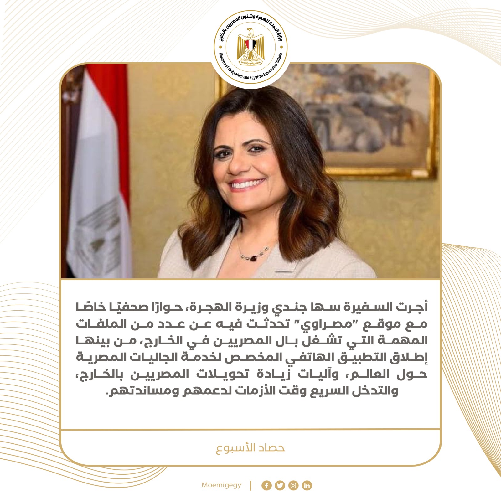 نشرت وزارة الدولة للهجرة وشئون المصريين بالخارج حصاد نشاط الوزارة هذا الأسبوع والذي تضمن عدد من الفعاليات وأبرزها ما يلي:
