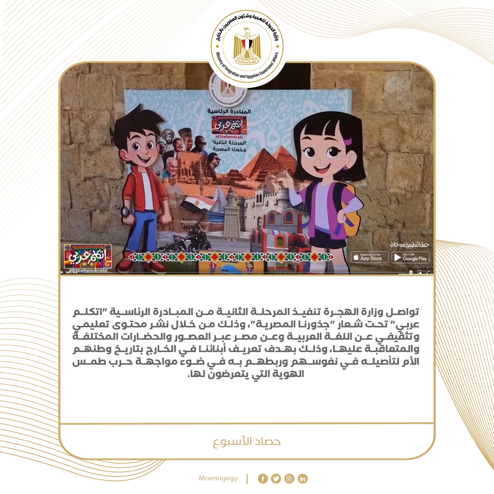 10- تواصل وزارة الهجرة تنفيذ المرحلة الثانية من المبادرة الرئاسية "اتكلم عربي" تحت شعار "جذورنا المصرية"، وذلك من خلال نشر محتوى تعليمي وتثقيفي عن اللغة العربية وعن مصر عبر العصور والحضارات المختلفة والمتعاقبة عليها، وذلك بهدف تعريف أبنائنا في الخارج بتاريخ وطنهم الأم لتأصيله في نفوسهم وربطهم به في ضوء مواجهة حرب طمس الهوية التي يتعرضون لها.