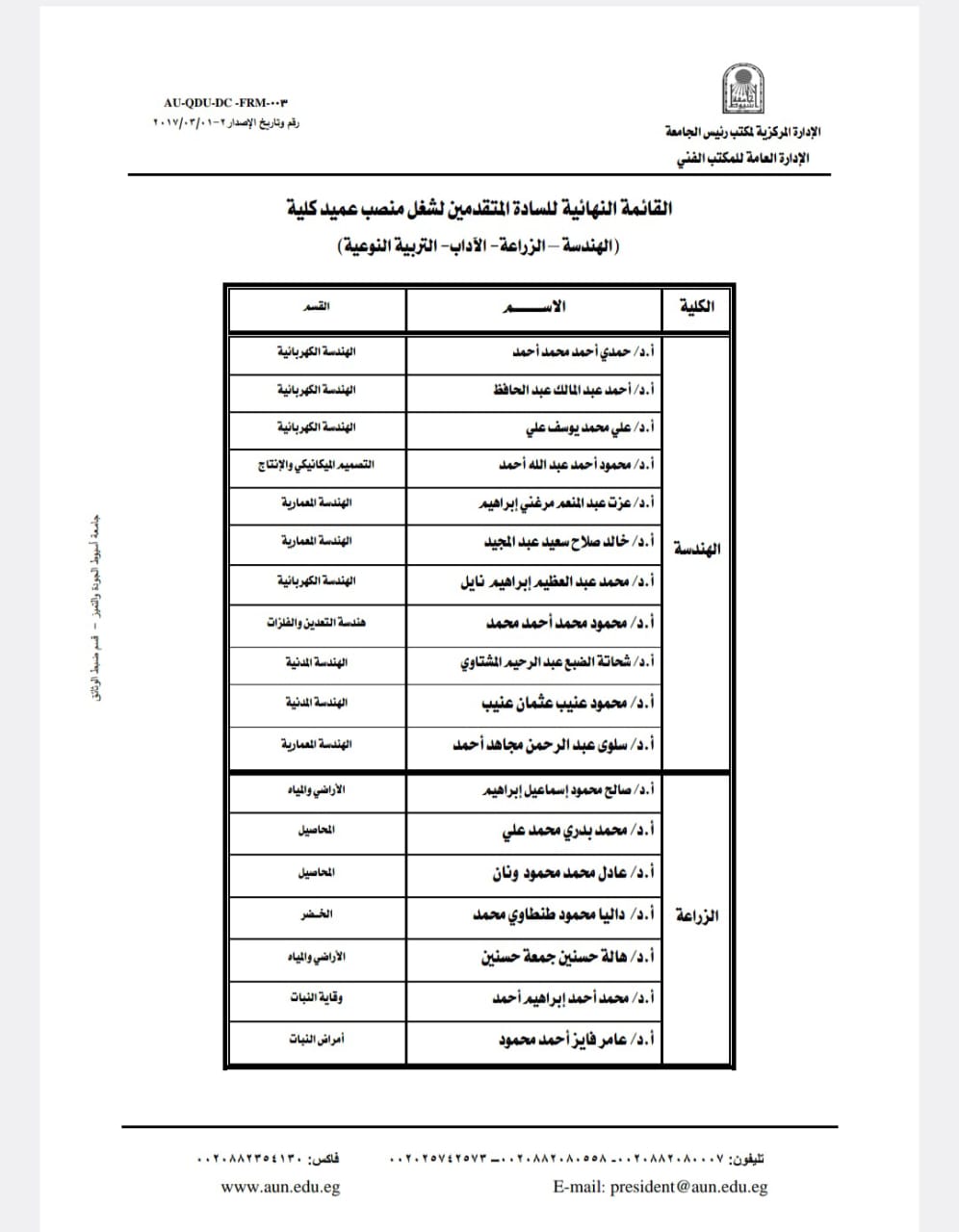 القائمة النهائية للمتقدمين لمنصب عميد كلية الزراعة